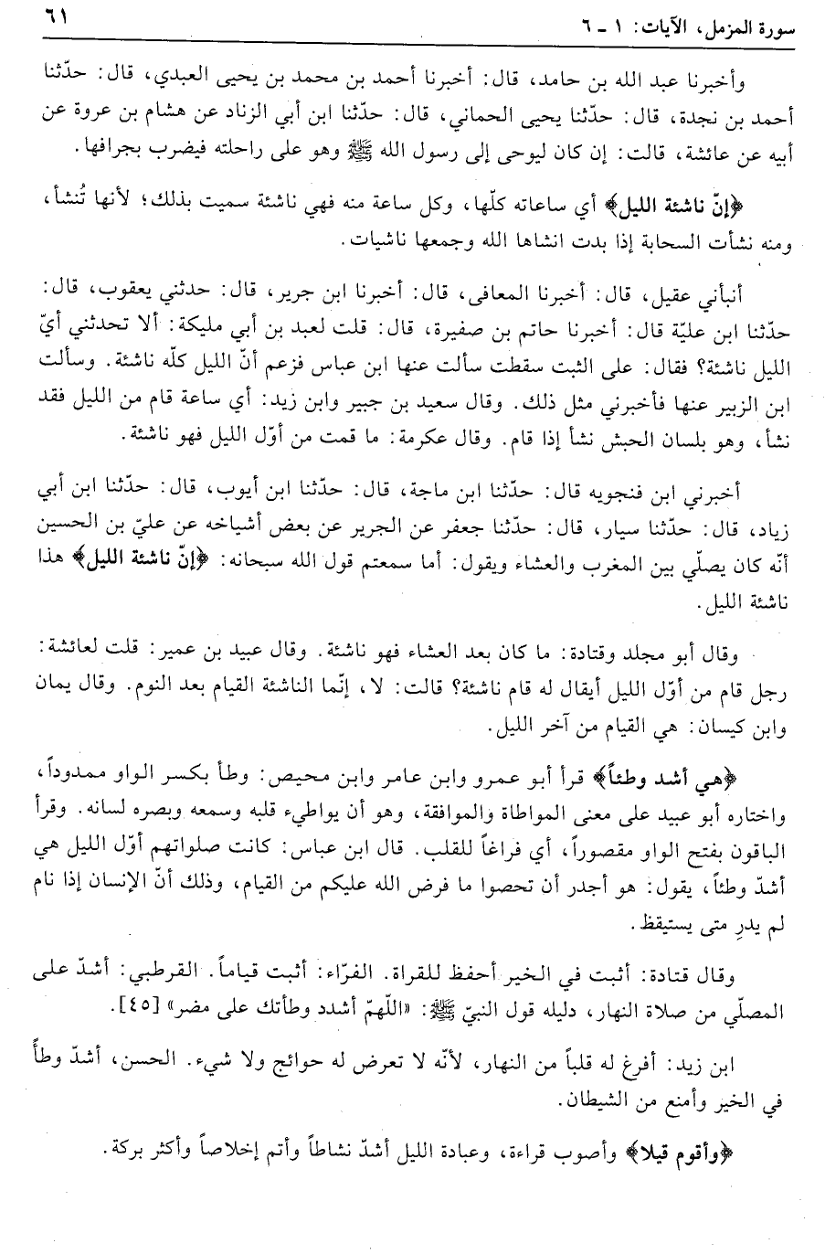 حدّثنا ابن عليّة قال: أخبرنا حاتم بن صفيرة، قال: قلت لعبد بن أبي مليكة: ألا تحدثني أيّ الليل ناشئة؟ فقال: على الثبت سقطت سألت عنها ابن عباس فزعم أنّ الليل كلّه ناشئة. وسألت ابن الزبير عنها فأخبرني مثل ذلك. وقال سعيد بن جبير وابن زيد: أي ساعة قام من الليل فقد نشأ، وهو بلسان الحبش نشأ إذا قام. وقال عكرمة: ما قمت من أوّل الليل فهو ناشئة.