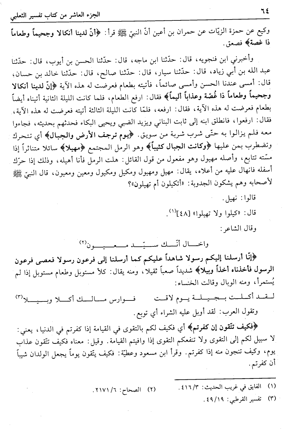 وأخبرني ابن فنجويه، قال: حدّثنا ابن ماجة، قال: حدّثنا الحسن بن أيوب، قال: حدّثنا عبد الله بن أبي زياد، قال: حدّثنا سيار، قال: حدّثنا صالح، قال: حدّثنا خالد بن حسان، قال: أمسى عندنا الحسن وأمسى صائما، فأتيته بطعام فعرضت له هذه الآية إِنَّ لَدَيْنا أَنْكالًا وَجَحِيماً وَطَعاماً ذا غُصَّةٍ وَعَذاباً أَلِيماً فقال: ارفع الطعام، فلما كانت الليلة الثانية أتيناه أيضا بطعام فعرضت له هذه الآية، فقال: ارفعه، فلمّا كانت الليلة الثالثة أتيته فعرضت له هذه الآية، فقال: ارفعوا، فانطلق ابنه إلى ثابت البناني ويزيد الضبي ويحيى البكاء فحدثهم بحديثه، فجاءوا معه فلم يزالوا به حتّى شرب شربة من سويق. يَوْمَ تَرْجُفُ الْأَرْضُ وَالْجِبالُ أي تتحرك وتضطرب بمن عليها وَكانَتِ الْجِبالُ كَثِيباً وهو الرمل المجتمع مَهِيلًا سائلا متناثرا إذا مسّته تتابع، وأصله مهيول وهو مفعول من قول القائل: هلت الرمل فأنا أهيله، وذلك إذا حرّك أسفله فانهال عليه من أعلاه، يقال: مهيل ومهيول ومكيل ومكيول ومعين ومعيون،