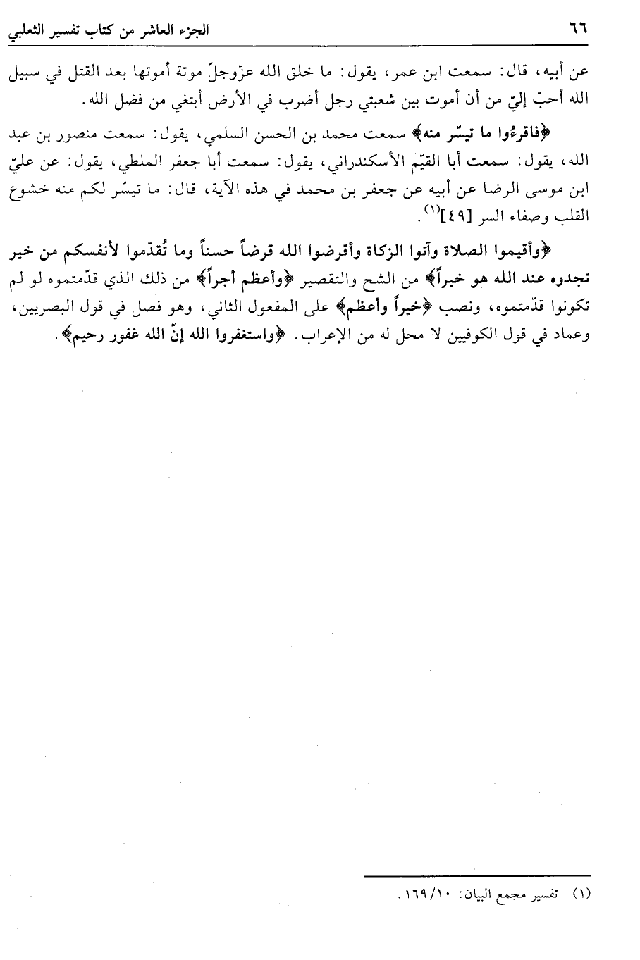 وَأَقِيمُوا الصَّلاةَ وَآتُوا الزَّكاةَ وَأَقْرِضُوا اللَّهَ قَرْضاً حَسَناً وَما تُقَدِّمُوا لِأَنْفُسِكُمْ مِنْ خَيْرٍ تَجِدُوهُ عِنْدَ اللَّهِ هُوَ خَيْراً من الشح والتقصير وَأَعْظَمَ أَجْراً من ذلك الذي قدّمتموه لو لم تكونوا قدّمتموه، ونصب خَيْراً وَأَعْظَمَ على المفعول الثاني، وهو فصل في قول البصريين، وعماد في قول الكوفيين لا محل له من الإعراب. وَاسْتَغْفِرُوا اللَّهَ إِنَّ اللَّهَ غَفُورٌ رَحِيمٌ.