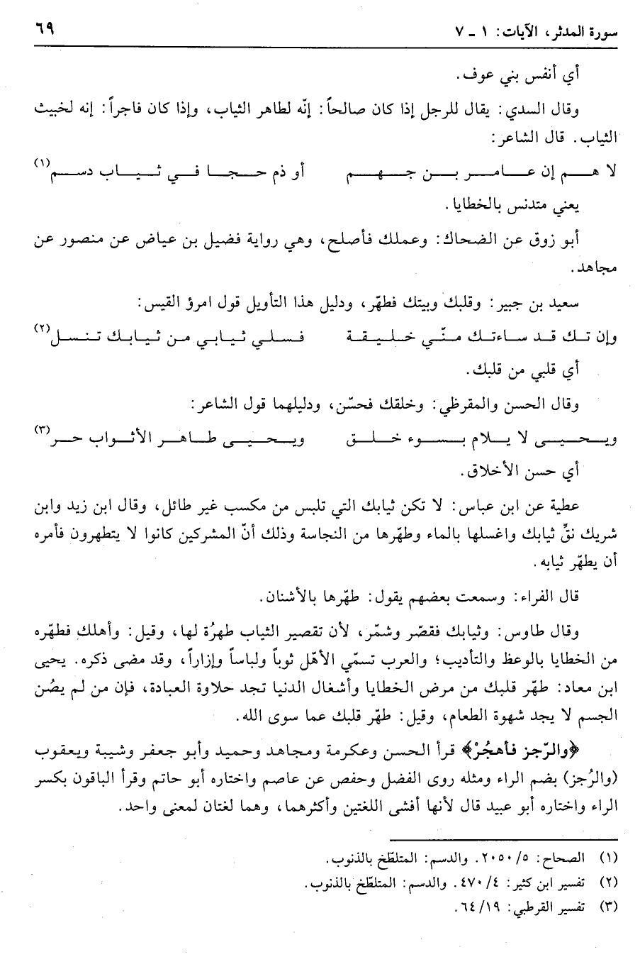 وقال طاوس: وثيابك فقصّر وشمّر، لأن تقصير الثياب طهرة لها، وقيل: وأهلك فطهّره من الخطايا بالوعظ والتأديب والعرب تسمّي الأهّل ثوبا ولباسا وإزارا، وقد مضى ذكره. يحيى ابن معاد: طهّر قلبك من مرض الخطايا وأشغال الدنيا تجد حلاوة العبادة، فإن من لم يصن الجسم لا يجد شهوة الطعام، وقيل: طهّر قلبك عما سوى الله.