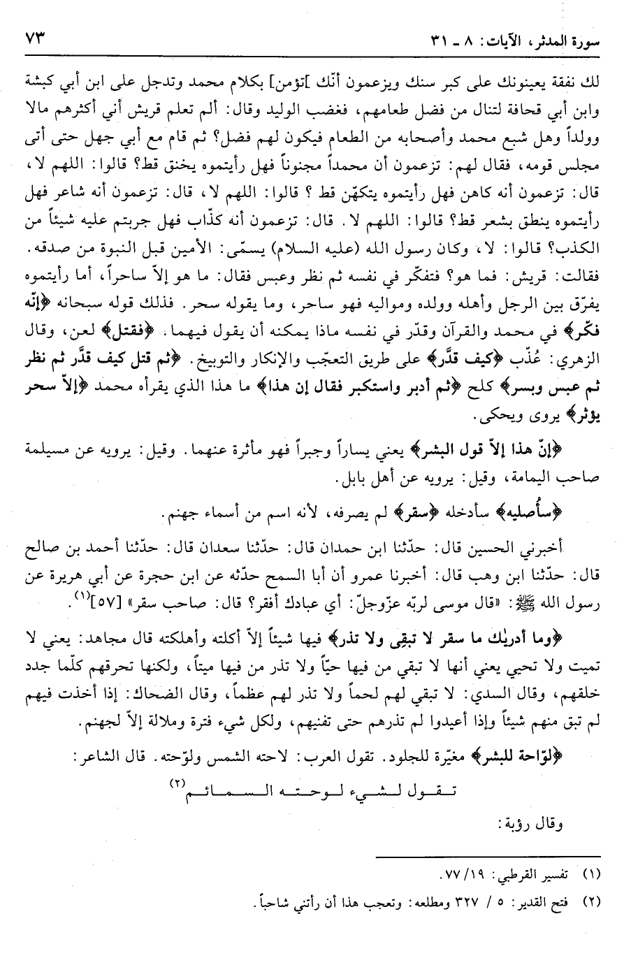 فذلك قوله سبحانه إِنَّهُ فَكَّرَ في محمد والقرآن وَقَدَّرَ في نفسه ماذا يمكنه أن يقول فيهما. فَقُتِلَ لعن، وقال الزهري: عذّب كَيْفَ قَدَّرَ على طريق التعجّب والإنكار والتوبيخ. ثُمَّ قُتِلَ كَيْفَ قَدَّرَ ثُمَّ نَظَرَ ثُمَّ عَبَسَ وَبَسَرَ كلح ثُمَّ أَدْبَرَ وَاسْتَكْبَرَ فَقالَ إِنْ هذا ما هذا الذي يقرأه محمد إِلَّا سِحْرٌ يُؤْثَرُ يروى ويحكى.