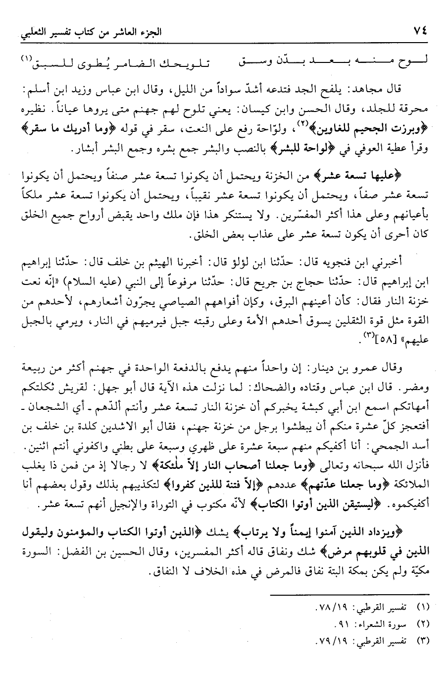 عَلَيْها تِسْعَةَ عَشَرَ من الخزنة ويحتمل أن يكونوا تسعة عشر صنفا ويحتمل أن يكونوا تسعة عشر صفا، ويحتمل أن يكونوا تسعة عشر نقيبا، ويحتمل أن يكونوا تسعة عشر ملكا بأعيانهم وعلى هذا أكثر المفسّرين. ولا يستنكر هذا فإن ملك واحد يقبض أرواح جميع الخلق كان أحرى أن يكون تسعة عشر على عذاب بعض الخلق.