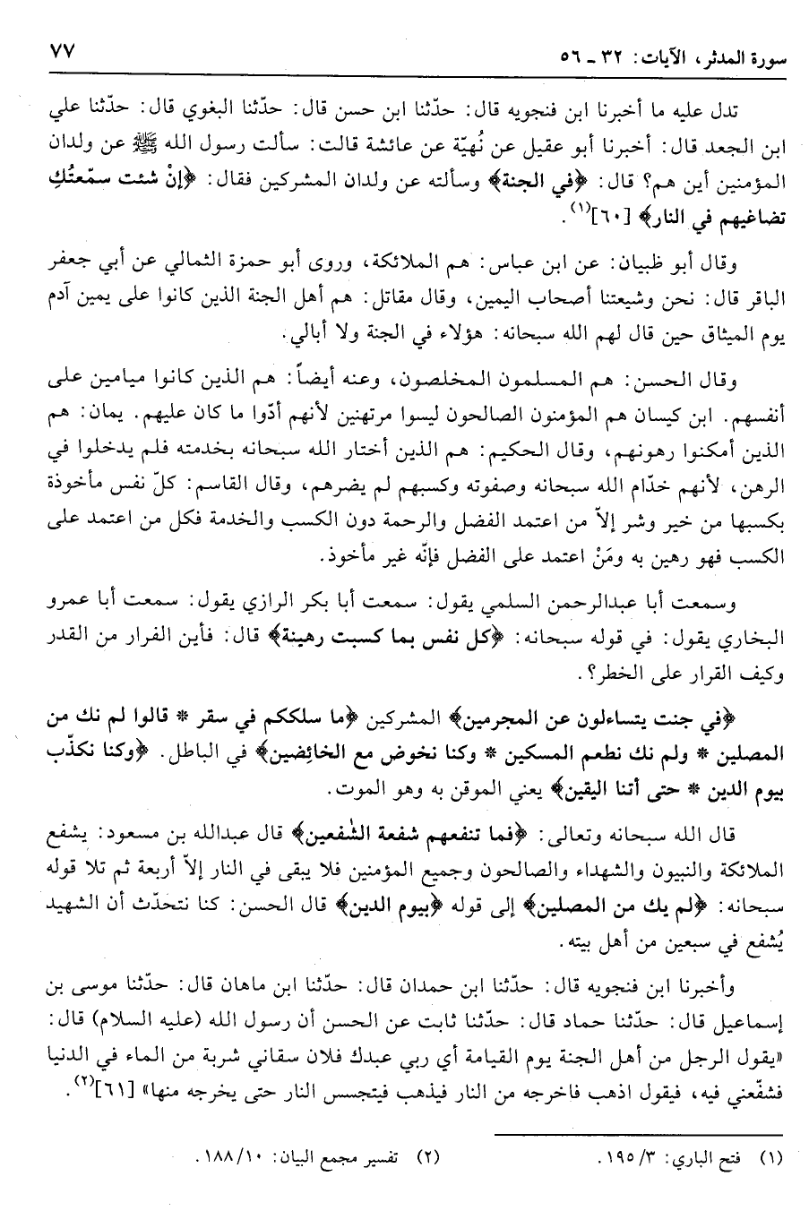 فِي جَنَّاتٍ يَتَساءَلُونَ عَنِ الْمُجْرِمِينَ المشركين ما سَلَكَكُمْ فِي سَقَرَ قالُوا لَمْ نَكُ مِنَ الْمُصَلِّينَ وَلَمْ نَكُ نُطْعِمُ الْمِسْكِينَ وَكُنَّا نَخُوضُ مَعَ الْخائِضِينَ في الباطل. وَكُنَّا نُكَذِّبُ بِيَوْمِ الدِّينِ حَتَّى أَتانَا الْيَقِينُ يعني الموقن به وهو الموت.