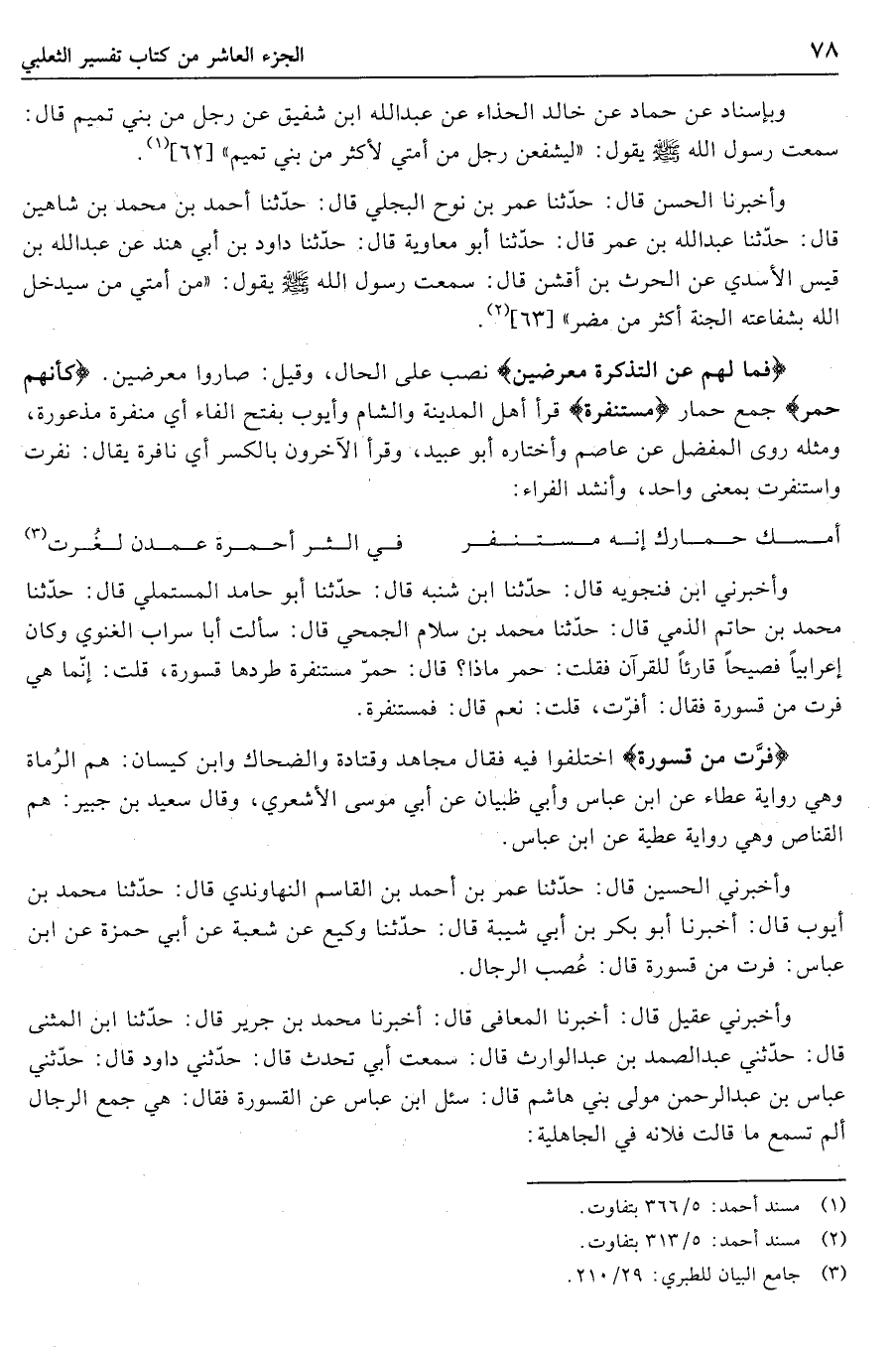 وأخبرني ابن فنجويه قال: حدّثنا ابن شنبه قال: حدّثنا أبو حامد المستملي قال: حدّثنا محمد بن حاتم الذمي قال: حدّثنا محمد بن سلام الجمحي قال: سألت أبا سراب الغنوي وكان أعرابيا فصيحا قارئا للقرآن فقلت: حمر ماذا؟ قال: حمر مستنفرة طردها قسورة، قلت: إنّما هي فَرَّتْ مِنْ قَسْوَرَةٍ فقال: أفَرَّتْ، قلت: نعم قال: ف مُسْتَنْفِرَةٌ.