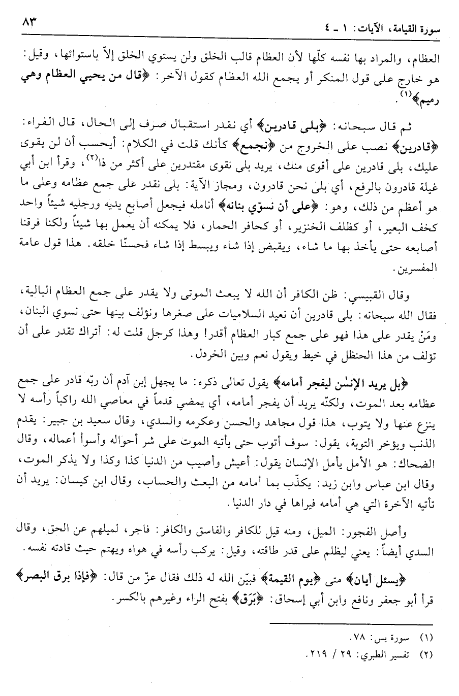 وقال القبيسي: ظن الكافر أن الله لا يبعث الموتى ولا يقدر على جمع العظام البالية، فقال الله سبحانه: بَلى قادِرِينَ أن نعيد السلاميات على صغرها ونؤلف بينها حتى نسوي البنان، ومن يقدر على هذا فهو على جمع كبار العظام أقدر! وهذا كرجل قلت له: أتراك تقدر على أن تؤلف من هذا الحنظل في خيط ويقول نعم وبين الخردل.