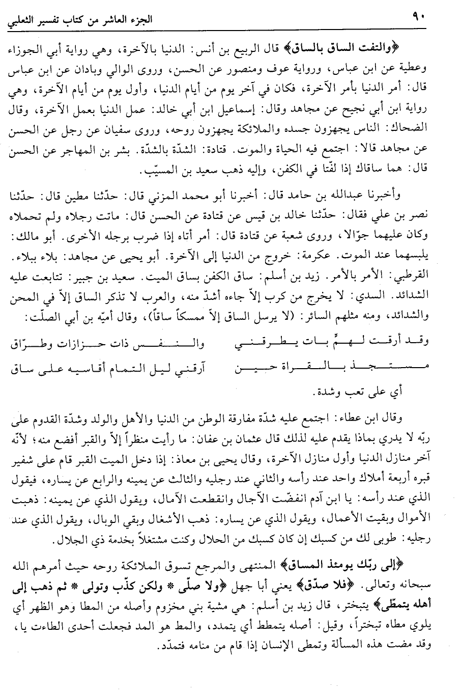 وَالْتَفَّتِ السَّاقُ بِالسَّاقِ قال الربيع بن أنس: الدنيا بالآخرة، وهي رواية أبي الجوزاء وعطية عن ابن عباس، ورواية عوف ومنصور عن الحسن، وروى الوالي وبادان عن ابن عباس قال: أمر الدنيا بأمر الآخرة، فكان في آخر يوم من أيام الدنيا، وأول يوم من أيام الآخرة، وهي رواية ابن أبي نجيح عن مجاهد وقال: إسماعيل ابن أبي خالد: عمل الدنيا بعمل الآخرة، وقال الضحاك: الناس يجهزون جسده والملائكة يجهزون روحه، وروى سفيان عن رجل عن الحسن عن مجاهد قالا: اجتمع فيه الحياة والموت. قتادة: الشدّة بالشدّة. بشر بن المهاجر عن الحسن قال: هما ساقاك إذا لفّتا في الكفن، وإليه ذهب سعيد بن المسيّب.