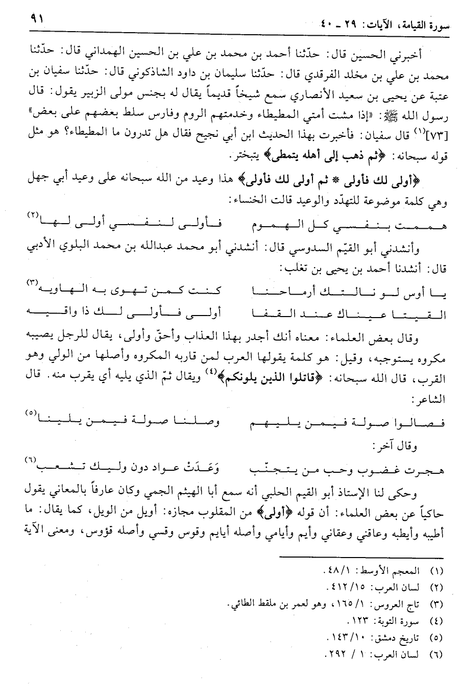 أَوْلى لَكَ فَأَوْلى ثُمَّ أَوْلى لَكَ فَأَوْلى هذا وعيد من الله سبحانه على وعيد أبي جهل وهي كلمة موضوعة للتهدّد والوعيد قالت الخنساء: