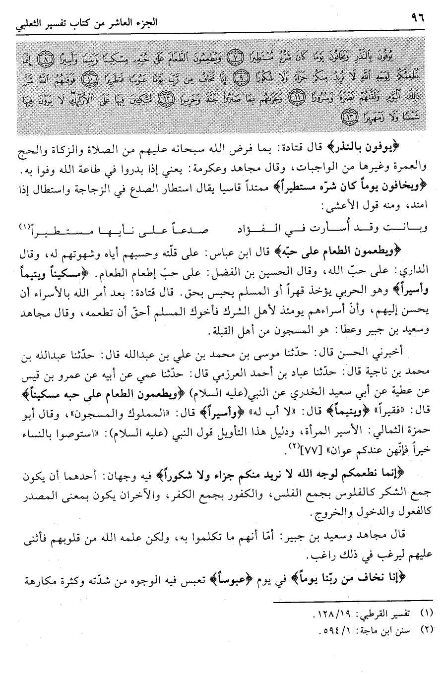 يُوفُونَ بِالنَّذْرِ وَيَخافُونَ يَوْماً كانَ شَرُّهُ مُسْتَطِيراً (7) وَيُطْعِمُونَ الطَّعامَ عَلى حُبِّهِ مِسْكِيناً وَيَتِيماً وَأَسِيراً (8) إِنَّما نُطْعِمُكُمْ لِوَجْهِ اللَّهِ لا نُرِيدُ مِنْكُمْ جَزاءً وَلا شُكُوراً (9) إِنَّا نَخافُ مِنْ رَبِّنا يَوْماً عَبُوساً قَمْطَرِيراً (10) فَوَقاهُمُ اللَّهُ شَرَّ ذلِكَ الْيَوْمِ وَلَقَّاهُمْ نَضْرَةً وَسُرُوراً (11)