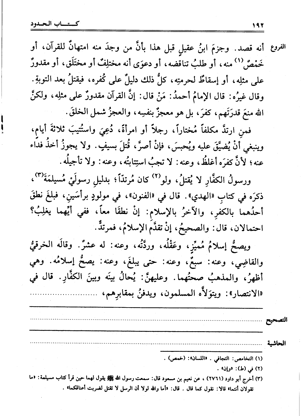 أَنَّهُ قَصْدٌ, وَجَزَمَ ابْنُ عَقِيلٍ قَبْلَ هَذَا بِأَنَّ مَنْ وُجِدَ مِنْهُ امْتِهَانٌ لِلْقُرْآنِ أَوْ خَمْصٌ1 مِنْهُ أَوْ طَلَبُ تَنَاقُضِهِ, أَوْ دَعْوَى أَنَّهُ مُخْتَلِفٌ أَوْ مُخْتَلِقٌ, أَوْ مَقْدُورٌ عَلَى مِثْلِهِ أَوْ إسْقَاطٌ لِحُرْمَتِهِ, كُلُّ ذَلِكَ دَلِيلٌ عَلَى كُفْرِهِ, فَيُقْتَلُ بَعْدَ التَّوْبَةِ. وَقَالَ غَيْرُهُ: قَالَ الْإِمَامُ أَحْمَدُ مَنْ قَالَ: إنَّ الْقُرْآنَ مَقْدُورٌ عَلَى مِثْلِهِ وَلَكِنَّ اللَّهَ مَنَعَ قُدْرَتَهُمْ, كَفَرَ بَلْ هُوَ مُعْجِزٌ بِنَفْسِهِ, وَالْعَجْزُ شَمَلَ الْخَلْقَ.