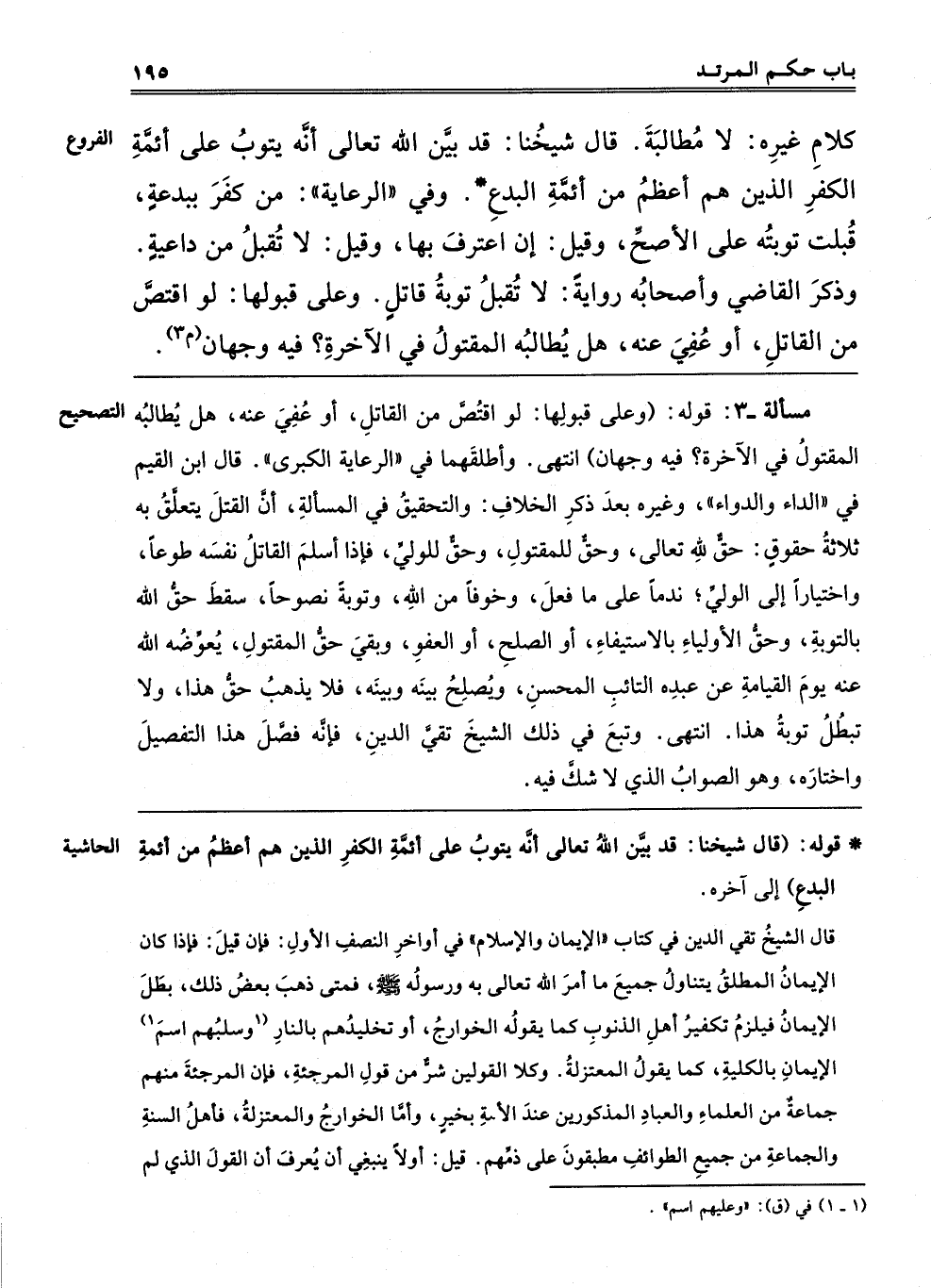 كَلَامِ غَيْرِهِ: لَا مُطَالَبَةَ. قَالَ شَيْخُنَا: قَدْ بَيَّنَ اللَّهُ تَعَالَى أَنَّهُ يَتُوبُ عَلَى أَئِمَّةِ الْكُفْرِ الَّذِينَ هُمْ أَعْظَمُ مِنْ أَئِمَّةِ الْبِدَعِ, وَفِي الرِّعَايَةِ: مَنْ كَفَرَ بِبِدْعَةٍ قُبِلَتْ تَوْبَتُهُ, عَلَى الْأَصَحِّ, وَقِيلَ: إنْ اعْتَرَفَ بِهَا, وَقِيلَ: لَا تُقْبَلُ مِنْ دَاعِيَةٍ, وَذَكَرَ الْقَاضِي وَأَصْحَابُهُ رِوَايَةً: لَا تُقْبَلُ تَوْبَةُ قَاتِلٍ, وَعَلَى قَبُولِهَا لَوْ اقْتَصَّ مِنْ الْقَاتِلِ أَوْ عَفَا عَنْهُ هَلْ يُطَالِبُهُ الْمَقْتُولُ فِي الْآخِرَةِ؟ فِيهِ وَجْهَانِ "م 3"