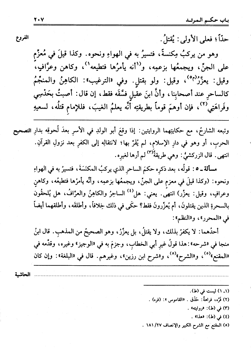 "مَسْأَلَةٌ 5" قَوْلُهُ بَعْدَ ذِكْرِهِ حُكْمَ السَّاحِرِ الَّذِي يَرْكَبُ الْمِكْنَسَةَ فَتَسِيرُ بِهِ فِي الْهَوَاءِ وَنَحْوِهِ "وَكَذَا قِيلَ فِي مُعَزِّمٍ عَلَى الْجِنِّ وَيَجْمَعُهَا بِزَعْمِهِ وَأَنَّهُ يَأْمُرُهَا فَتُعْطِيه, وَكَاهِنٍ وَعَرَّافٍ, وَقِيلَ: يعزر" انتهى. يعني هل4 السَّاحِرَ وَالْكَاهِنَ وَالْعَرَّافَ هَلْ يَلْحَقُونَ بِالسَّحَرَةِ الَّذِينَ يُقْتَلُونَ, أَمْ يُعَزَّرُونَ فَقَطْ؟ حَكَى فِي ذَلِكَ خِلَافًا, وَأَطْلَقَهُ, وَأَطْلَقَهُمَا أَيْضًا فِي الْمُحَرَّرِ وَالنَّظْمِ.
