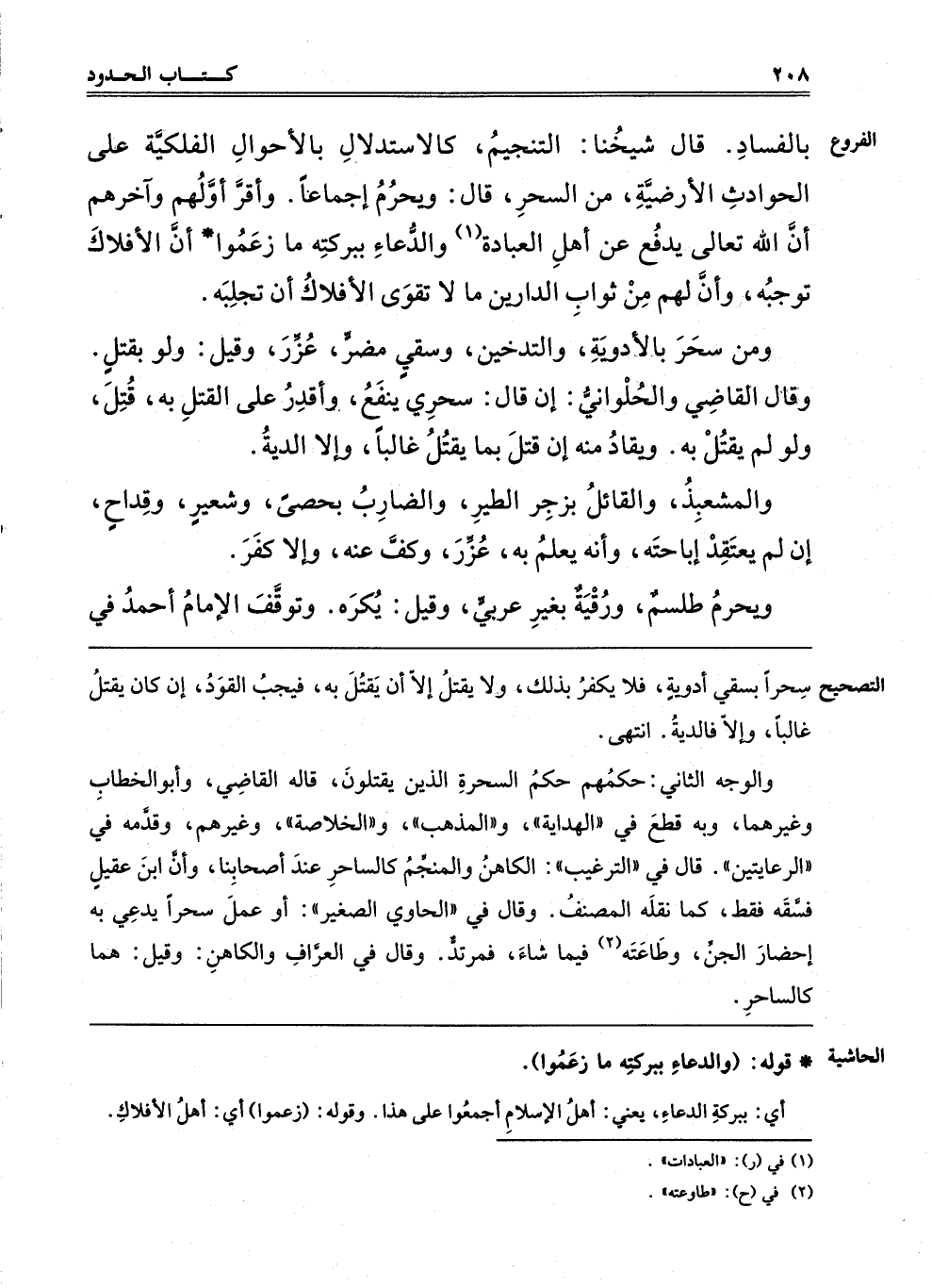 "وَالْوَجْهُ الثَّانِي": حُكْمُهُمْ حُكْمُ السَّحَرَةِ الَّذِينَ يُقْتَلُونَ, قَالَهُ الْقَاضِي وَأَبُو الْخَطَّابِ وَغَيْرُهُمَا, وَبِهِ قَطَعَ فِي الْهِدَايَةِ وَالْمُذْهَبِ وَالْخُلَاصَةِ وَغَيْرِهِمْ, وَقَدَّمَهُ فِي الرِّعَايَتَيْنِ, قَالَ فِي التَّرْغِيبِ: الْكَاهِنُ وَالْمُنَجِّمُ كَالسَّاحِرِ عند أصحابنا, وأن ابن عقيل فسقه فقط, كَمَا نَقَلَهُ الْمُصَنِّفُ. وَقَالَ فِي الْحَاوِي الصَّغِيرِ: أَوْ عَمِلَ سِحْرًا يَدَّعِي بِهِ إحْضَارَ الْجِنِّ وَطَاعَتَهُ2 فِيمَا شَاءَ فَمُرْتَدٌّ, وَقَالَ فِي الْعَرَّافِ والكاهن وقيل: هما كالساحر.