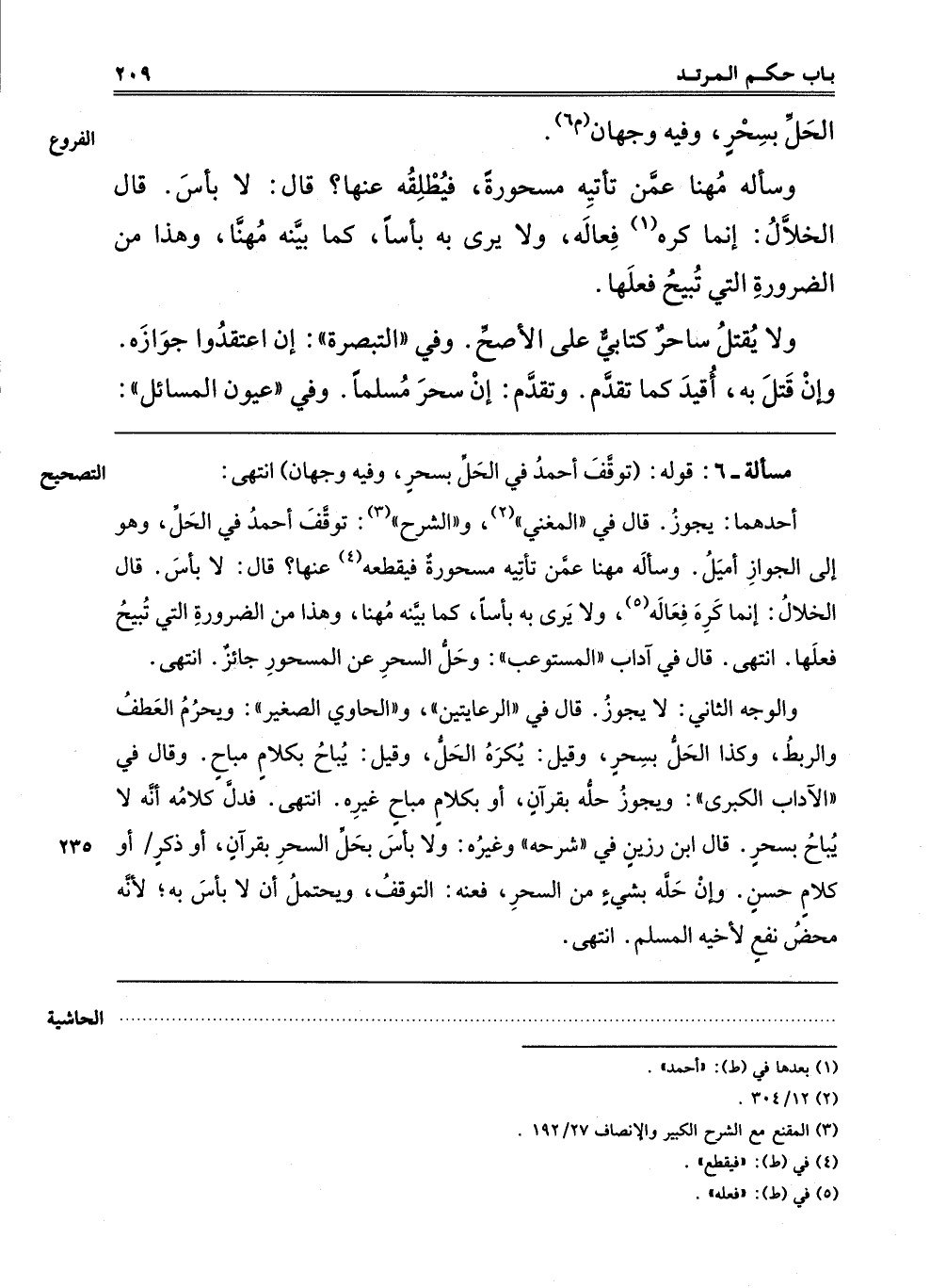 "أَحَدُهُمَا": يَجُوزُ, قَالَ فِي الْمُغْنِي2 وَالشَّرْحِ3: تَوَقَّفَ أَحْمَدُ فِي الْحِلِّ, وَهُوَ إلَى الْجَوَازِ أَمْيَلُ, وَسَأَلَهُ مُهَنَّا عَمَّنْ تَأْتِيه مَسْحُورَةٌ فَيَقْطَعُهُ4 عَنْهَا, قَالَ: لَا بَأْسَ, قَالَ الخلال: إنَّمَا كَرِهَ فِعَالَهُ5 وَلَا يَرَى بِهِ بَأْسًا, كَمَا بَيَّنَهُ مُهَنَّا, وَهَذَا مِنْ الضَّرُورَةِ الَّتِي يُبِيحُ فِعْلَهَا, انْتَهَى. قَالَ فِي آدَابِ الْمُسْتَوْعِبِ: وَحِلُّ السِّحْرِ عَنْ الْمَسْحُورِ جَائِزٌ, انْتَهَى.