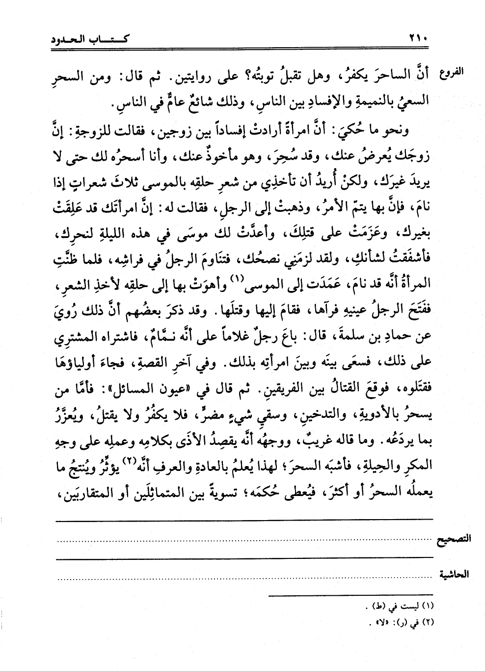 أَنَّ السَّاحِرَ يُكَفَّرُ, وَهَلْ تُقْبَلُ تَوْبَتُهُ؟ عَلَى رِوَايَتَيْنِ. ثُمَّ قَالَ: وَمِنْ السِّحْرِ السَّعْيُ بِالنَّمِيمَةِ وَالْإِفْسَادُ بَيْنَ النَّاسِ وَذَلِكَ شَائِعٌ عَامٌّ فِي النَّاسِ.