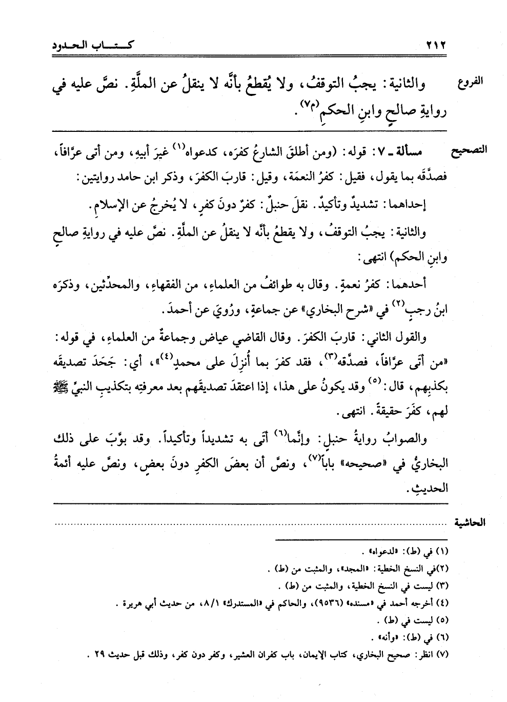 وَالصَّوَابُ رِوَايَةُ حنبل, وإنَّمَا6 أَتَى بِهِ تَشْدِيدًا وَتَأْكِيدًا, وَقَدْ بَوَّبَ عَلَى ذَلِكَ الْبُخَارِيُّ فِي صَحِيحِهِ بَابًا7, وَنَصَّ أَنَّ بَعْضَ الْكُفْرِ دُونَ بَعْضٍ, وَنَصَّ عَلَيْهِمَا أئمة الحديث,