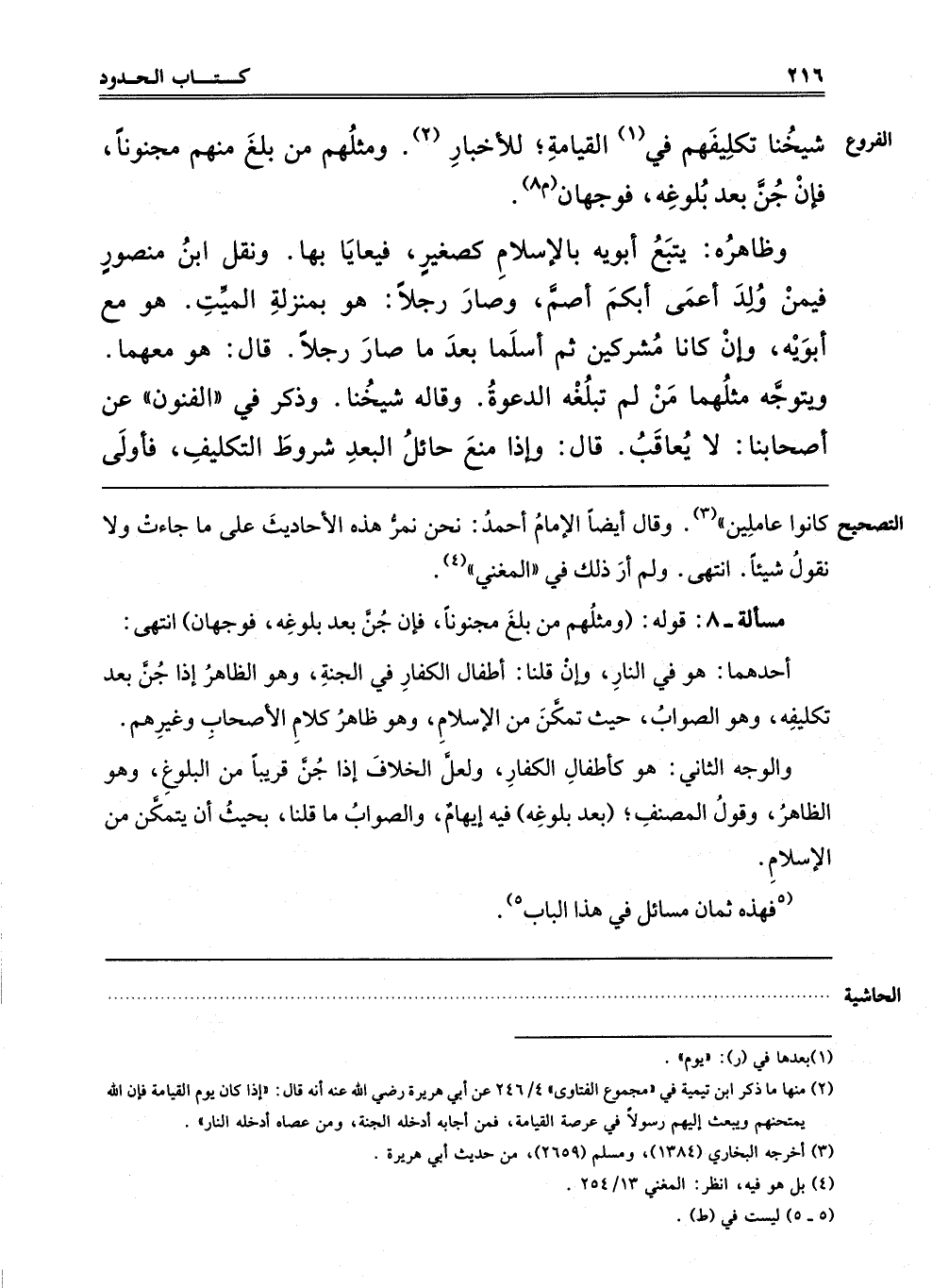 شَيْخُنَا تَكْلِيفَهُمْ فِي1 الْقِيَامَةِ, لِلْأَخْبَارِ2 وَمِثْلُهُمْ مَنْ بَلَغَ مِنْهُمْ مَجْنُونًا, فَإِنْ جُنَّ بَعْدَ بُلُوغِهِ فَوَجْهَانِ "م 8".