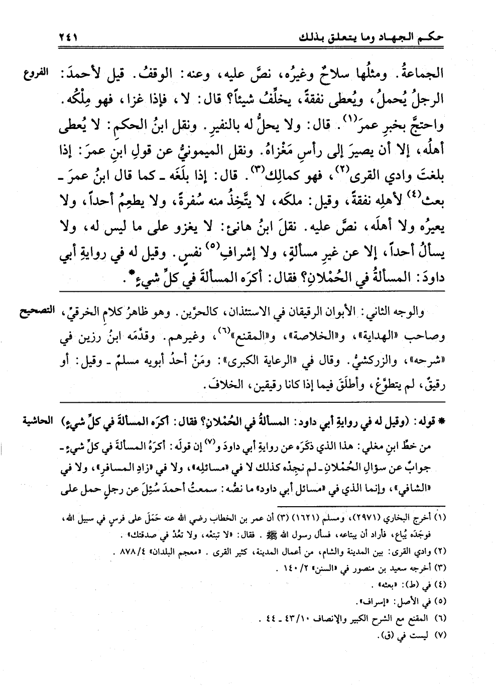 الْجَمَاعَةُ وَمِثْلُهَا سِلَاحٌ وَغَيْرُهُ, نَصَّ عَلَيْهِ, وَعَنْهُ الْوَقْفُ, قِيلَ لِأَحْمَدَ: الرَّجُلُ يَحْمِلُ وَيُعْطِي نَفَقَةً يَخْلُفُ شَيْئًا؟ قَالَ: لَا فَإِذَا غَزَا فَهُوَ مِلْكُهُ, وَاحْتَجَّ بِخَبَرِ عُمَرَ1, قَالَ: وَلَا يَحِلُّ لَهُ بِالنَّفِيرِ. وَنَقَلَ ابْنُ الْحَكَمِ: لَا يُعْطِي أَهْلَهُ إلَّا أَنْ يَصِيرَ إلَى رَأْسِ مَغْزَاهُ, وَنَقَلَ الْمَيْمُونِيُّ عَنْ قَوْلِ ابْنِ عُمَرَ: إذَا بَلَغْت وَادِي الْقُرَى2 فَهُوَ كَمَالِكٍ3, قَالَ: إذَا بَلَغَهُ كَمَا قَالَ ابْنُ عُمَرَ بَعَثَ4 لِأَهْلِهِ نَفَقَةً, وَقِيلَ: مَلَكَهُ لَا يَتَّخِذُ مِنْهُ سُفْرَةً وَلَا يُطْعِمُ أَحَدًا وَلَا يُعِيرُهُ وَلَا أَهْلَهُ, نَصَّ عَلَيْهِ: نَقَلَ ابْنُ هَانِئٍ لَا يَغْزُو عَلَى مَا لَيْسَ لَهُ, وَلَا يَسْأَلُ أَحَدًا إلَّا عَنْ غَيْرِ مَسْأَلَةٍ وَلَا إشْرَافِ5 نَفْسٍ, وَقِيلَ لَهُ فِي رِوَايَةِ أَبِي دَاوُد الْمَسْأَلَةُ فِي الْحِمْلَانِ؟ فَقَالَ: أَكْرَهُ الْمَسْأَلَةَ فِي كُلِّ شيء.