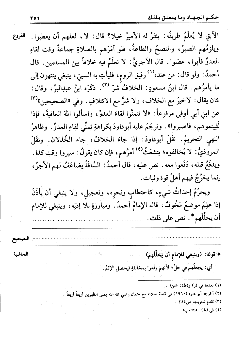 الْآبِقِ لَا يُعْلَمُ طَرِيقُهُ: يَنْفِرُ لَهُ الْأَمِيرُ خَيْلًا؟ قَالَ: لَا, لَعَلَّهُمْ أَنْ يُعْطِبُوا, وَيَلْزَمُهُمْ الصَّبْرُ وَالنُّصْحُ وَالطَّاعَةُ, فَلَوْ أَمَرَهُمْ بِالصَّلَاةِ جَمَاعَةً وَقْتَ لِقَاءِ الْعَدُوِّ فَأَبَوْا عَصَوْا, قَالَ الْآجُرِّيُّ: لَا نَعْلَمُ فِيهِ خِلَافًا بَيْنَ الْمُسْلِمِينَ. قَالَ أَحْمَدُ: وَلَوْ قَالَ: مَنْ عِنْدَهُ1 مِنْ رَقِيقِ الرُّومِ فَلْيَأْتِ بِهِ السَّبْيَ: يَنْبَغِي أَنْ يَنْتَهَوْا إلَى مَا يَأْمُرُهُمْ, قَالَ ابْنُ مَسْعُودٍ: الْخِلَافُ2 شَرٌّ, ذَكَرَهُ ابْنُ عَبْدِ الْبَرِّ, وَقَالَ: كَانَ يُقَالُ: لَا خَيْرَ مَعَ الْخِلَافِ وَلَا شَرَّ مَعَ الِائْتِلَافِ. وَفِي الصَّحِيحَيْنِ3 عَنْ ابْنِ أَبِي أَوْفَى مَرْفُوعًا "لَا تَتَمَنَّوْا لِقَاءَ الْعَدُوِّ وَاسْأَلُوا اللَّهَ الْعَافِيَةَ فَإِذَا لَقِيتُمُوهُمْ فَاصْبِرُوا" وَتَرْجَمَ عَلَيْهِ أَبُو دَاوُد بِكَرَاهَةِ تَمَّنِي لِقَاءِ الْعَدُوِّ, وَظَاهِرُ النَّهْيِ التَّحْرِيمُ, نَقَلَ أَبُو دَاوُد: إذَا جَاءَ الْخِلَافُ جَاءَ الْخِذْلَانُ. وَنَقَلَ الْمَرُّوذِيُّ: لَا يُخَالِفُوهُ يَتَشَعَّبُ4 أَمْرُهُمْ, فَإِنْ كَانَ يَقُولُ: سِيرُوا وَقْتَ كَذَا وَيَدْفَعُ قَبْلَهُ دَفَعُوا مَعَهُ نَصَّ عَلَيْهِ, قَالَ أَحْمَدُ: السَّاقَةُ يُضَاعَفُ لَهُمْ الْأَجْرُ, إنَّمَا يَخْرُجُ فِيهِمْ أَهْلُ قُوَّةٍ وَثَبَاتٍ.