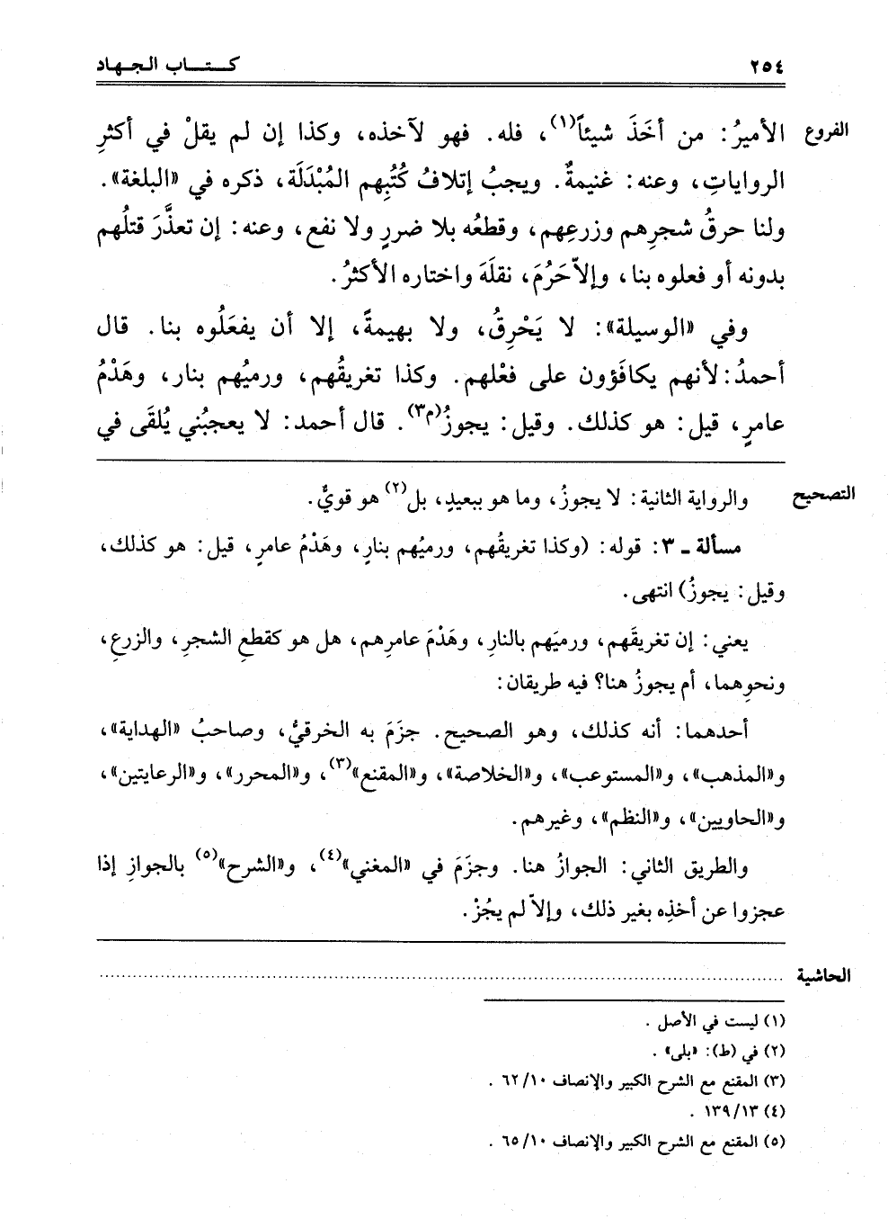 الأمير: من أخذ شَيْئًا1 فَلَهُ, فَهُوَ لِآخِذِهِ, وَكَذَا إنْ لَمْ يَقُلْ, فِي أَكْثَرِ الرِّوَايَاتِ. وَعَنْهُ: غَنِيمَةٌ, وَيَجِبُ إتْلَافُ كُتُبِهِمْ الْمُبَدَّلَةِ, ذَكَرَهُ فِي الْبُلْغَةِ. وَلَنَا حَرْقُ شَجَرِهِمْ وَزَرْعِهِمْ وَقَطْعُهُ بِلَا ضَرَرٍ وَلَا نَفْعٍ, وَعَنْهُ: إنْ تَعَذَّرَ قَتْلُهُمْ بِدُونِهِ أَوْ فَعَلُوهُ بِنَا وَإِلَّا حَرُمَ, نَقَلَهُ وَاخْتَارَهُ الْأَكْثَرُ.