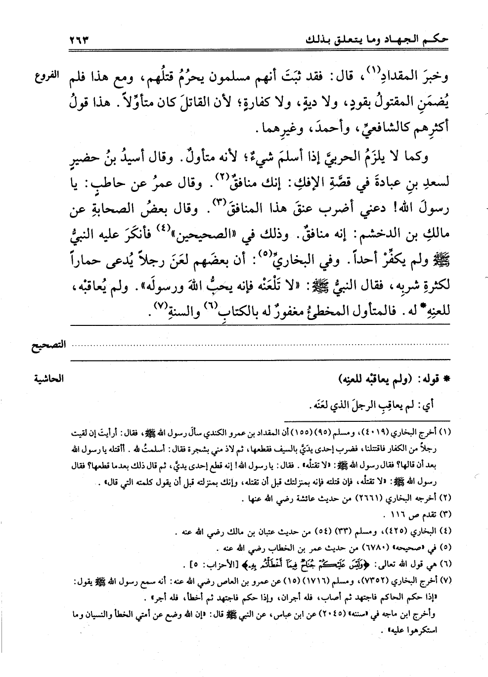 وَخَبَرُ الْمِقْدَادِ1, قَالَ: فَقَدْ ثَبَتَ أَنَّهُمْ مُسْلِمُونَ يَحْرُمُ قَتْلُهُمْ, وَمَعَ هَذَا فَلَمْ يَضْمَنْ الْمَقْتُولُ, بِقَوَدٍ وَلَا دِيَةٍ وَلَا كَفَّارَةٍ لِأَنَّ الْقَاتِلَ كَانَ مُتَأَوِّلًا, هَذَا قَوْلُ أَكْثَرِهِمْ كَالشَّافِعِيِّ وَأَحْمَدَ وَغَيْرِهِمَا.