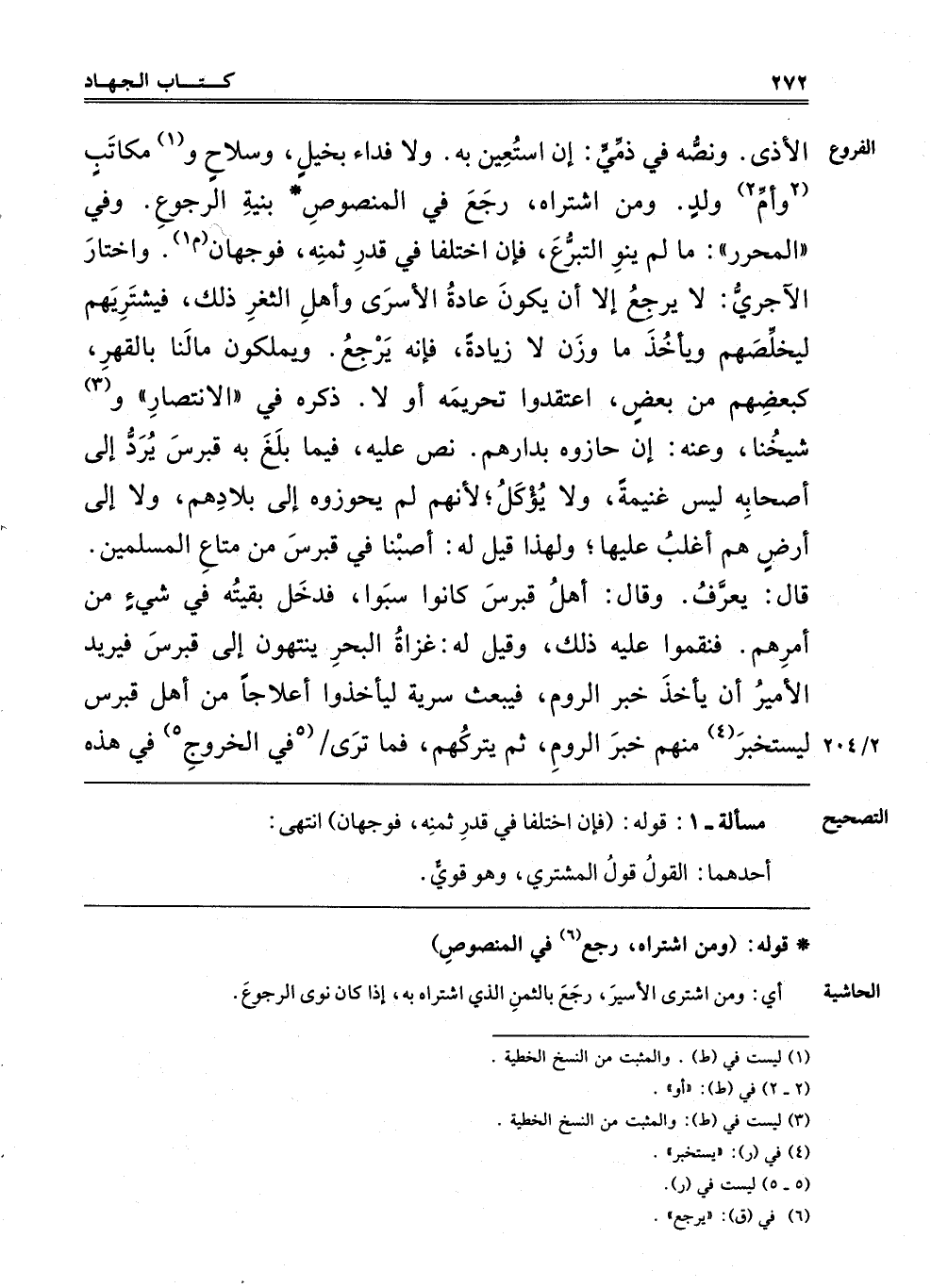 الْأَذَى, وَنَصُّهُ فِي ذِمِّيٍّ: إنْ اُسْتُعِينَ بِهِ, ولا فداء بخيل وسلاح و1مُكَاتَبٍ 2وَأُمِّ2 وَلَدٍ, وَمَنْ اشْتَرَاهُ رَجَعَ فِي الْمَنْصُوصِ بِنِيَّةِ الرُّجُوعِ. وَفِي الْمُحَرَّرِ: مَا لَمْ يَنْوِ التَّبَرُّعَ, فَإِنْ اخْتَلَفَا فِي قَدْرِ ثَمَنِهِ فوجهان "م 1" واختار الآجري: لَا يَرْجِعُ إلَّا أَنْ يَكُونَ عَادَةَ الْأَسْرَى وَأَهْلِ الثَّغْرِ ذَلِكَ, فَيَشْتَرِيهِمْ لِيُخَلِّصَهُمْ وَيَأْخُذَ مَا وَزَنَ لَا زِيَادَةَ فَإِنَّهُ يَرْجِعُ, وَيَمْلِكُونَ مَالنَا بِالْقَهْرِ, كَبَعْضِهِمْ مِنْ بَعْضٍ, اعْتَقَدُوا تَحْرِيمَهُ أَوْ لا, ذكره في الانتصار و3شَيْخُنَا, وَعَنْهُ: إنْ حَازُوهُ بِدَارِهِمْ, نَصَّ عَلَيْهِ فِيمَا بَلَغَ بِهِ قُبْرُسَ يُرَدُّ إلَى أَصْحَابِهِ لَيْسَ غَنِيمَةً وَلَا يُؤْكَلُ, لِأَنَّهُمْ لَمْ يَحُوزُوهُ إلَى بِلَادِهِمْ وَلَا إلَى أَرْضٍ هُمْ أَغْلَبُ عَلَيْهَا, وَلِهَذَا قِيلَ لَهُ: أَصَبْنَا فِي قُبْرُسَ مِنْ مَتَاعِ الْمُسْلِمِينَ قَالَ: يُعْرَفُ وَقَالَ: أَهْلُ قُبْرُسَ كَانُوا سُبُوا فَدَخَلَ بَقِيَّتُهُ فِي شَيْءٍ مِنْ أَمْرِهِمْ, فَنَقَمُوا عَلَيْهِ ذَلِكَ, وَقِيلَ لَهُ: غُزَاةُ الْبَحْرِ يَنْتَهُونَ إلَى قُبْرُسَ, فَيُرِيدُ الْأَمِيرُ أَنْ يَأْخُذَ خَبَرَ الرُّومِ فَيَبْعَثُ سَرِيَّةً لِيَأْخُذُوا أَعْلَاجًا مِنْ أَهْلِ قُبْرُسَ لِيَسْتَخْبِرَ4 مِنْهُمْ خَبَرَ الرُّومِ ثُمَّ يَتْرُكُهُمْ, فَمَا تَرَى 5فِي الْخُرُوجِ5 في هذه