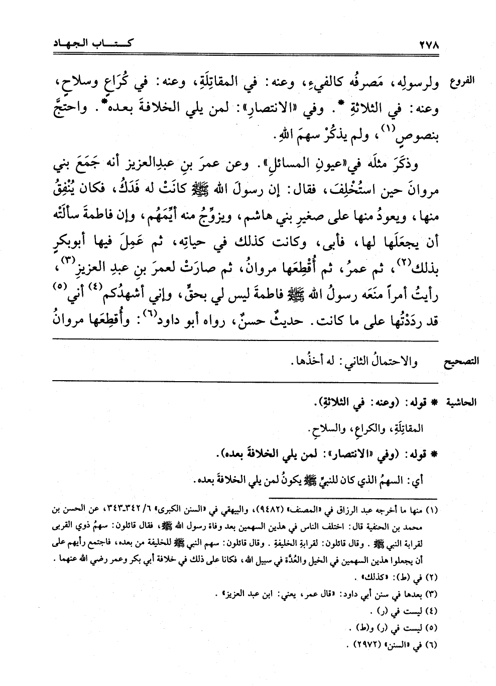 1 منها ما أخرجه عبد الرزاق في المصنف "9482" والبيهقي في السنن الكبرى "6/342 – 343" عن الحسن بن محمد بن الحنفية قال: اختلف الناس في هذين السهمين بعد وفاة رَسُولِ اللَّهِ صَلَّى اللَّهُ عَلَيْهِ وَسَلَّمَ فَقَالَ قائلون: سهم ذوي القربى لقرابة النبي صلى الله عليه وسلم وقال قائلون: لقرابة الخليفة: سهم النبي صلى الله عليه وسلم للخليفة من بعده فاجتمع رأيهم على أن يجعلوا هذين السهمين في الخيل والعدة في سبيل الله فكانا على ذلك في خلافة أبي بكر وعمر رضي الله عنهما.