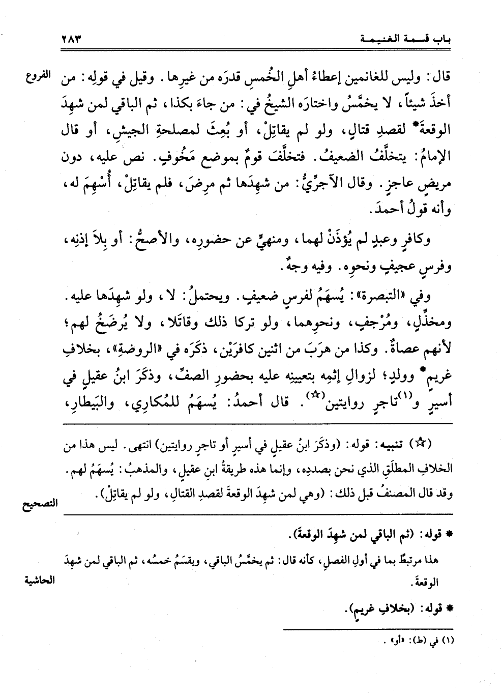 ـــــــــــــــــــــــــــــQتَنْبِيهٌ" قَوْلُهُ: "وَذَكَرَ ابْنُ عَقِيلٍ فِي أَسِيرٍ أَوْ تَاجِرٍ رِوَايَتَيْنِ" انْتَهَى. لَيْسَ هَذَا مِنْ الْخِلَافِ الْمُطْلَقِ الَّذِي نَحْنُ بِصَدَدِهِ وَإِنَّمَا هَذِهِ طَرِيقَةُ ابْنِ عَقِيلٍ, وَالْمَذْهَبُ: يُسْهِمُ لَهُمْ. وَقَدْ قَالَ الْمُصَنِّفُ قَبْل ذَلِكَ: وَهِيَ لِمَنْ شَهِدَ الوقعة لقصد القتال ولو لم يقاتل.