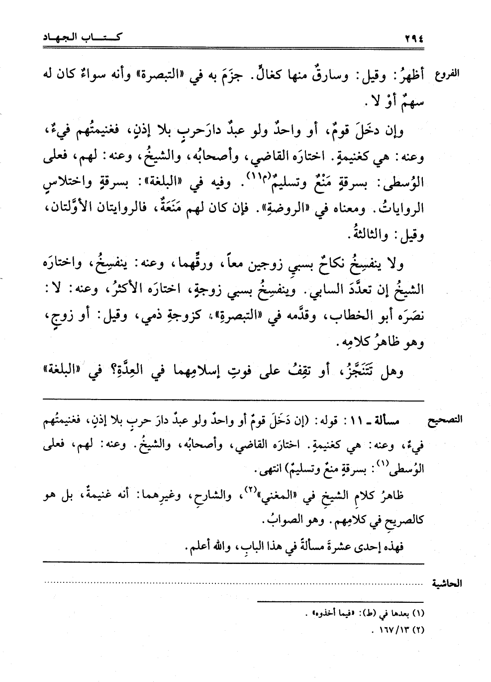 وَإِنْ دَخَلَ قَوْمٌ أَوْ وَاحِدٌ وَلَوْ عَبْدٌ إلَى دَارِ حَرْبٍ بِلَا إذْنٍ فَغَنِيمَتُهُمْ فَيْءٍ, وَعَنْهُ: كَغَنِيمَةٍ, اخْتَارَهُ الْقَاضِي وَأَصْحَابُهُ وَالشَّيْخُ, وَعَنْهُ: لَهُمْ, فَعَلَى الْوُسْطَى بِسَرِقَةٍ مَنْعٌ وَتَسْلِيمٌ "م 11" وَفِيهِ فِي الْبُلْغَةِ بِسَرِقَةٍ وَاخْتِلَاسٍ الرِّوَايَاتُ. وَمَعْنَاهُ فِي الرَّوْضَةِ, فَإِنْ كَانَ لَهُمْ مَنَعَةٌ فَالرِّوَايَتَانِ الْأُولَتَانِ, وَقِيلَ: وَالثَّالِثَةُ.