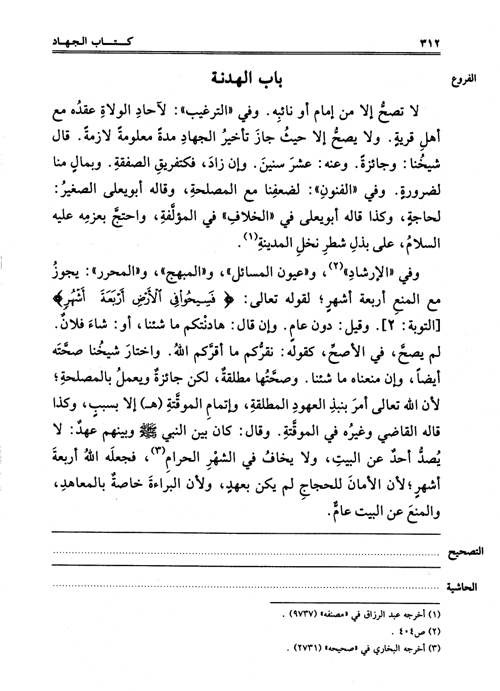 لَا تَصِحُّ إلَّا مِنْ إمَامٍ أَوْ نَائِبِهِ. وَفِي التَّرْغِيبِ: لِآحَادِ الْوُلَاةِ عَقْدُهُ مَعَ أَهْلِ قَرْيَةٍ, وَلَا يَصِحُّ إلَّا حَيْثُ جَازَ تَأْخِيرُ الْجِهَادِ مُدَّةً مَعْلُومَةً لَازِمَةً, قَالَ شَيْخُنَا: وَجَائِزَةٌ, وَعَنْهُ عَشْرُ سِنِينَ, وَإِنْ زَادَ فَكَتَفْرِيقِ الصَّفْقَةِ. وَبِمَالٍ مِنَّا لِضَرُورَةٍ. وَفِي الْفُنُونِ: لِضَعْفِنَا مَعَ الْمَصْلَحَةِ. وَقَالَهُ أَبُو يَعْلَى الصَّغِيرُ: لِحَاجَةٍ, وَكَذَا قَالَهُ أَبُو يَعْلَى فِي الْخِلَافِ فِي الْمُؤَلَّفَةِ, وَاحْتَجَّ بِعَزْمِهِ عَلَيْهِ السَّلَامُ عَلَى بَذْلِ شَطْرِ نَخْلِ الْمَدِينَةِ1.