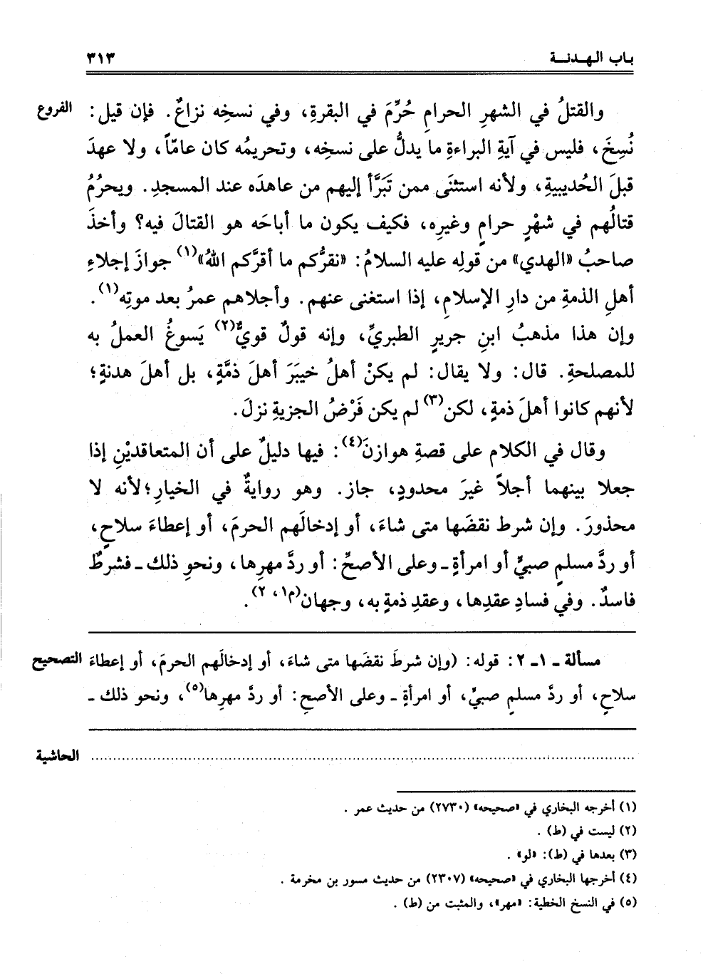 وَالْقَتْلُ فِي الشَّهْرِ الْحَرَامِ حُرِّمَ فِي الْبَقَرَةِ, وَفِي نَسْخِهِ نِزَاعٌ, فَإِنْ قِيلَ نُسِخَ فَلَيْسَ فِي آيَةِ الْبَرَاءَةِ مَا يَدُلُّ عَلَى نَسْخِهِ, وَتَحْرِيمُهُ كَانَ عَامًّا, وَلَا عَهْدَ قَبْلَ الْحُدَيْبِيَةِ, وَلِأَنَّهُ اسْتَثْنَى مِمَّنْ تَبْرَأَ إلَيْهِمْ مَنْ عَاهَدَهُ عِنْدَ الْمَسْجِدِ, وَيَحْرُمُ قِتَالُهُمْ فِي شَهْرٍ حَرَامٍ وَغَيْرِهِ, فَكَيْفَ يَكُونُ مَا أَبَاحَهُ هُوَ الْقِتَالُ فِيهِ, وَأَخَذَ صَاحِبُ الْهَدْيِ مِنْ قَوْلِهِ عَلَيْهِ السَّلَامُ "نُقِرّكُمْ مَا أَقَرَّكُمْ اللَّهُ" 1 جَوَازَ إجْلَاءِ أَهْلِ الذِّمَّةِ مِنْ دَارِ الْإِسْلَامِ إذَا اُسْتُغْنِيَ عَنْهُمْ, وَأَجَلَاهُمْ عُمَرُ بَعْدَ مَوْتِهِ, وَإِنَّ هَذَا مَذْهَبُ ابْنِ جَرِيرٍ الطَّبَرِيِّ, وَإِنَّهُ قَوْلٌ قَوِيٌّ2 يَسُوغُ الْعَمَلُ بِهِ لِلْمَصْلَحَةِ, قَالَ: وَلَا يُقَالُ لَمْ يَكُنْ أَهْلُ خَيْبَرَ أَهْلَ ذِمَّةٍ, بَلْ أَهْلَ هُدْنَةٍ, لِأَنَّهُمْ كَانُوا أَهْلَ ذِمَّةٍ, لَكِنْ3 لَمْ يَكُنْ فَرْضُ الْجِزْيَةِ نَزَلَ.
