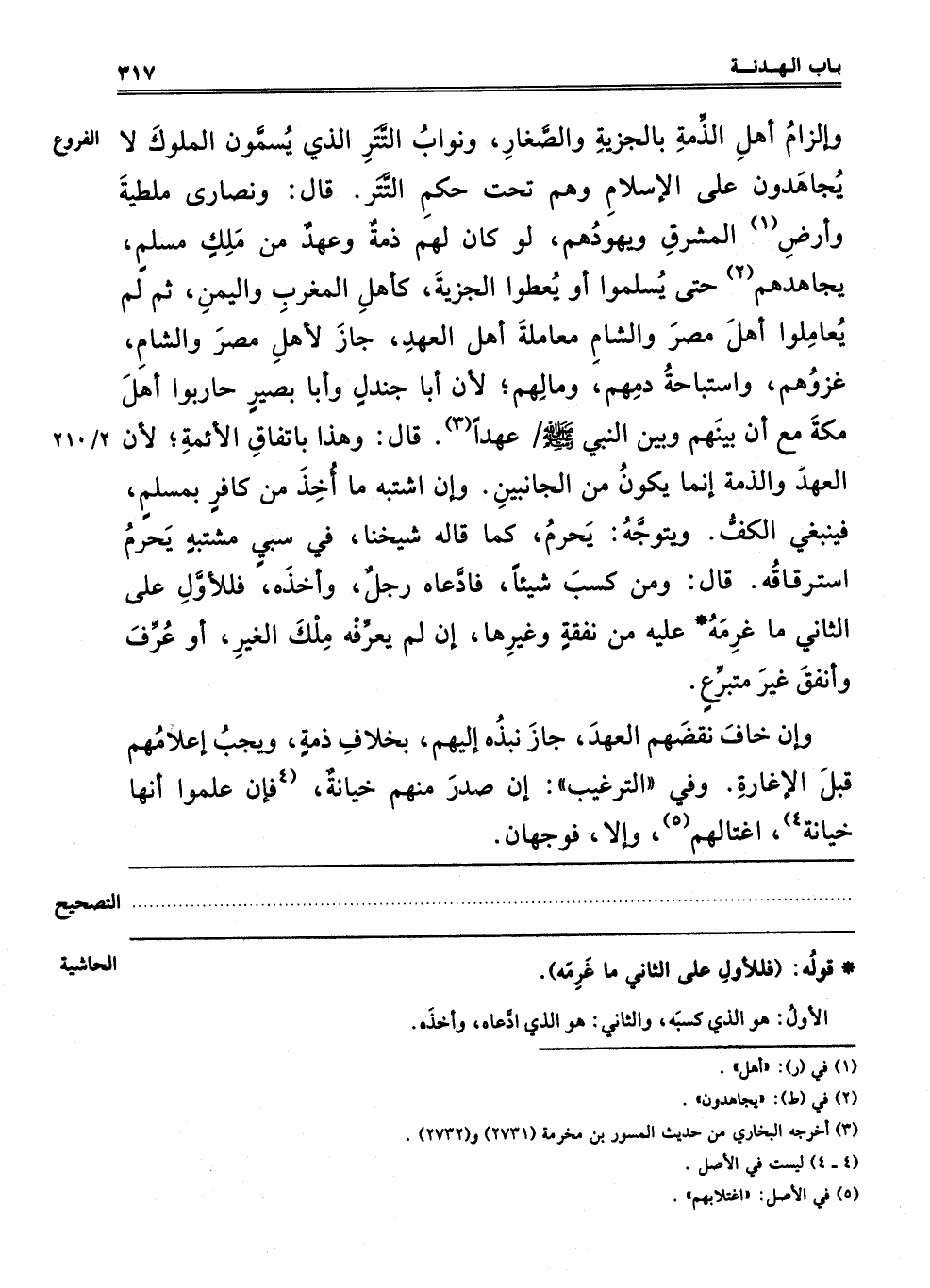 وَإِلْزَامُ أَهْلِ الذِّمَّةِ بِالْجِزْيَةِ وَالصِّغَارِ, وَنُوَّابِ التَّتَرِ الَّذِينَ يُسَمَّوْنَ الْمُلُوكَ لَا يُجَاهِدُونَ عَلَى الْإِسْلَامِ وَهُمْ تَحْتَ حُكْمِ التَّتَرِ, قَالَ: وَنَصَارَى مَلَطْيَةَ وَأَرْضِ1 الْمَشْرِقِ وَيَهُودُهُمْ لَوْ كَانَ لَهُمْ ذِمَّةٌ وَعَهْدٌ مِنْ مَلِكٍ مُسْلِمٍ يُجَاهِدُهُمْ2 حَتَّى يُسَلِّمُوا أَوْ يُعْطُوا الْجِزْيَةَ كَأَهْلِ الْمَغْرِبِ وَالْيَمَنِ, ثُمَّ لَمْ يُعَامَلُوا أَهْلَ مِصْرَ وَالشَّامِ مُعَامَلَةَ أَهْلِ الْعَهْدِ, جَازَ لِأَهْلِ مِصْرَ وَالشَّامِ غَزْوُهُمْ وَاسْتِبَاحَةُ دَمِهِمْ وَمَالِهِمْ; لِأَنَّ أَبَا جَنْدَلٍ وَأَبَا بَصِيرٍ حَارَبُوا أَهْلَ مَكَّةَ مَعَ أَنَّ بَيْنَهُمْ وَبَيْنَ النَّبِيِّ صَلَّى اللَّهُ عَلَيْهِ وَسَلَّمَ عَهْدًا3, قَالَ: وَهَذَا بِاتِّفَاقِ الْأَئِمَّةِ, لِأَنَّ الْعَهْدَ وَالذِّمَّةَ إنَّمَا يَكُونُ مِنْ الْجَانِبَيْنِ, وَإِنْ اشْتَبَهَ أَنَّ مَا أُخِذَ مِنْ كَافِرٍ بِمُسْلِمٍ فَيَنْبَغِي الْكَفُّ, وَيَتَوَجَّهُ: يَحْرُمُ, كَمَا قَالَهُ شَيْخُنَا فِي سَبْيِ مُشْتَبَهٍ يَحْرُمُ اسْتِرْقَاقُهُ, قَالَ: وَمَنْ كَسَبَ شَيْئًا فَادَّعَاهُ رَجُلٌ وَأَخَذَهُ فَلِلْأَوَّلِ عَلَى الثَّانِي مَا غَرِمَهُ عَلَيْهِ مِنْ نَفَقَةٍ وَغَيْرِهَا إنْ لَمْ يَعْرِفْهُ مِلْكَ الْغَيْرِ أَوْ عَرَفَ وَأَنْفَقَ غَيْرَ مُتَبَرِّعٍ.
