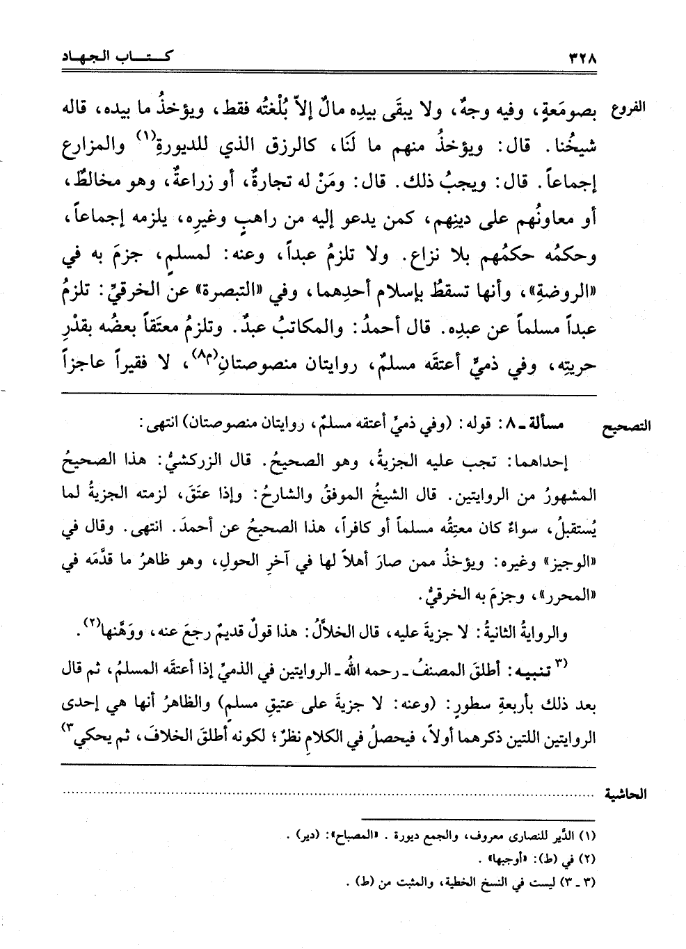 3"تَنْبِيهٌ" أَطْلَقَ الْمُصَنِّفُ رَحِمَهُ اللَّهُ الرِّوَايَتَيْنِ فِي الذِّمِّيِّ إذَا أَعْتَقَهُ الْمُسْلِمُ ثُمَّ قَالَ بَعْدَ ذَلِكَ بِأَرْبَعَةِ سُطُورٌ, وَعَنْهُ: لَا جِزْيَةَ عَلَى عَتِيقٍ مُسْلِمٍ, وَالظَّاهِرُ أَنَّهَا هِيَ إحْدَى الرِّوَايَتَيْنِ اللَّتَيْنِ ذَكَرَهُمَا أَوَّلًا, فَيَحْصُلُ فِي الْكَلَامِ نَظَرٌ لكونه أطلق الخلاف, ثم يحكي3