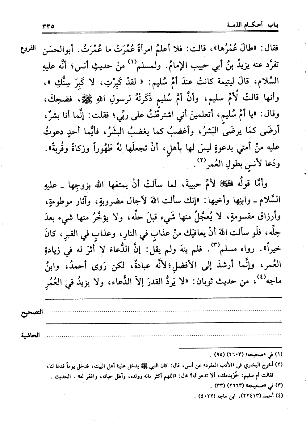 وَأَمَّا قَوْلُهُ عَلَيْهِ السَّلَامُ لِأُمِّ حَبِيبَةَ لَمَّا سَأَلَتْ أَنْ يُمَتِّعَهَا اللَّهُ بِزَوْجِهَا عَلَيْهِ السَّلَامُ وَابْنِهَا وَأَخِيهَا " إنَّكِ سَأَلْتِ اللَّهَ لِآجَالٍ مَضْرُوبَةٍ, وَآثَارٍ مَوْطُوءَةٍ, وَأَرْزَاقٍ مَقْسُومَةٍ, لَا يُعَجَّلُ مِنْهَا شَيْءٌ قَبْلَ أَجَلِهِ, وَلَا يُؤَخَّرُ مِنْهَا شَيْءٌ بَعْدَ أَجَلِهِ, فَلَوْ سَأَلْتِ اللَّهَ أَنْ يُعَافِيَكِ مِنْ عَذَابٍ فِي النَّارِ وَعَذَابٍ فِي الْقَبْرِ كَانَ خَيْرًا" رَوَاهُ مُسْلِمٌ3, فَلَمْ يَنْهَ وَلَمْ يَقُلْ إنَّ الدُّعَاءَ لَا أَثَرَ لَهُ فِي زِيَادَةِ الْعُمُرِ, وَإِنَّمَا أَرْشَدَ إلَى الْأَفْضَلِ لِأَنَّهُ عِبَادَةٌ. لَكِنْ رَوَى أَحْمَدُ وَابْنُ مَاجَهْ4 مِنْ حَدِيثِ ثَوْبَانَ "لَا يَرُدُّ الْقَدَرَ إلا الدعاء, لا يزيد في العمر