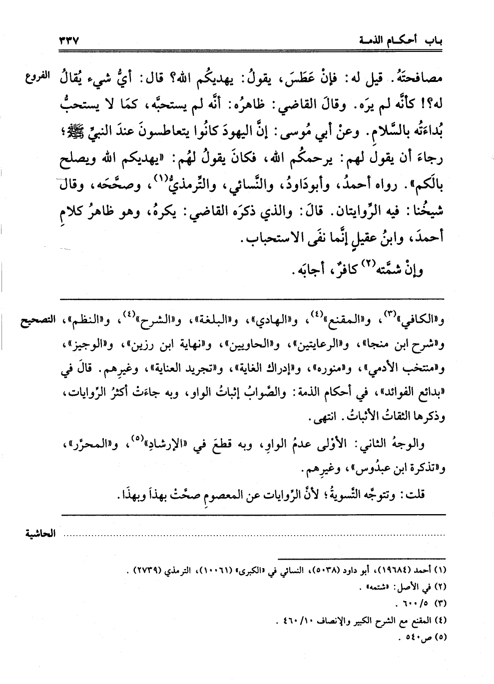 ـــــــــــــــــــــــــــــQوَالْكَافِي3 وَالْمُقْنِعِ4 وَالْهَادِي وَالْبُلْغَةِ وَالشَّرْحِ4 وَالنَّظْمِ وَشَرْحِ ابْنِ مُنَجَّى وَالرِّعَايَتَيْنِ وَالْحَاوِيَيْنِ وَنِهَايَةِ ابْنِ رَزِينٍ وَالْوَجِيزِ وَمُنْتَخَبِ الْآدَمِيِّ وَمُنَوِّرِهِ وَإِدْرَاكِ الْغَايَةِ وَتَجْرِيدِ الْعِنَايَةِ وَغَيْرِهِمْ, قَالَ فِي "بَدَائِعِ الْفَوَائِدِ" و "أَحْكَامِ الذِّمَّةِ" لَهُ: وَالصَّوَابُ إثْبَاتُ الْوَاوِ, وَبِهِ جَاءَتْ أَكْثَرُ الرِّوَايَاتِ, وَذَكَرَهَا الثِّقَاتُ الْأَثْبَاتُ, انْتَهَى.