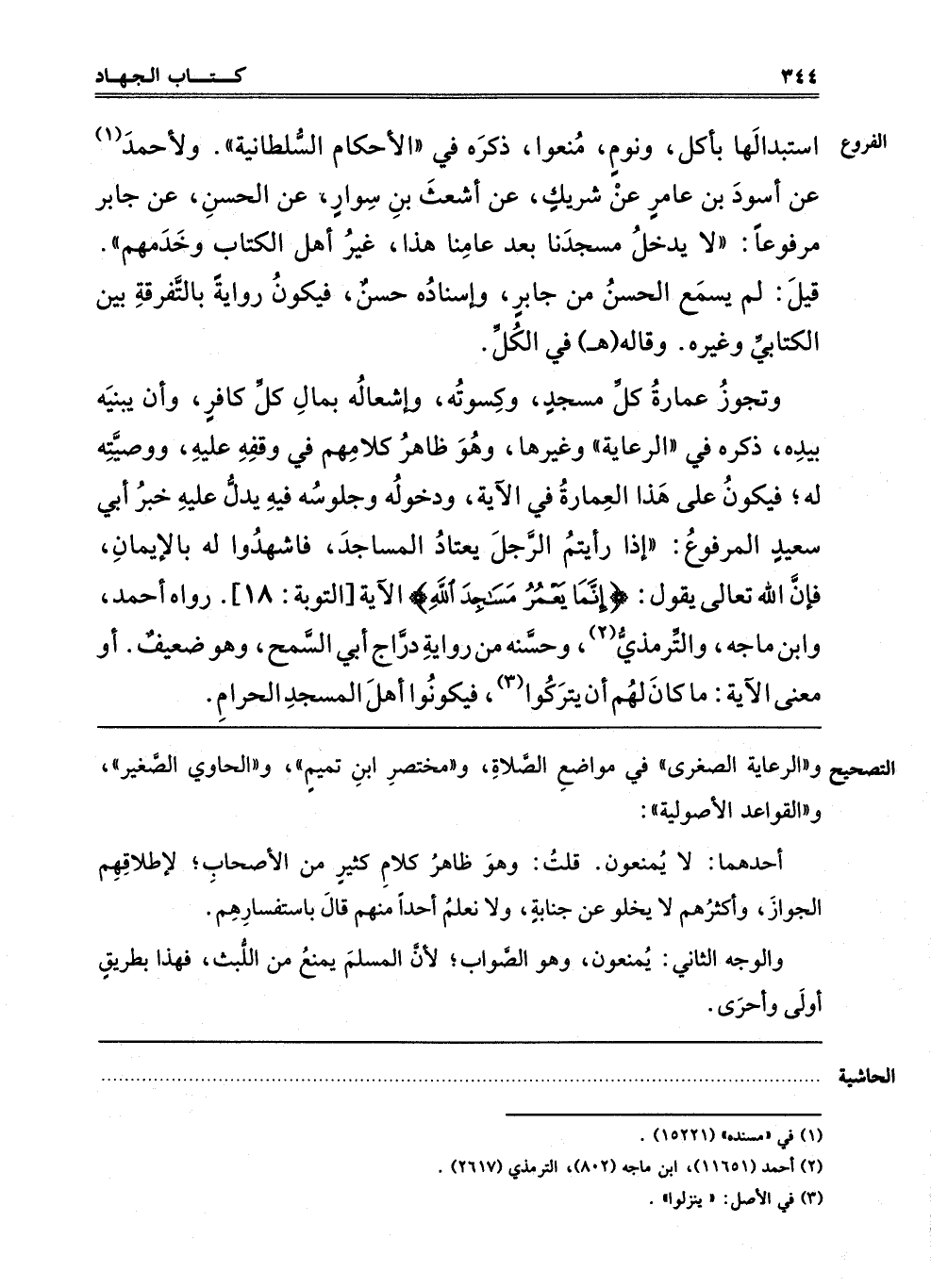 اسْتِبْدَالَهَا بِأَكْلٍ وَنَوْمٍ مُنِعُوا ذَكَرَهُ فِي الْأَحْكَامِ السُّلْطَانِيَّةِ. وَلِأَحْمَدَ1 عَنْ أَسْوَدَ بْنِ عَامِرٍ عَنْ شَرِيكٍ عَنْ أَشْعَثَ بْنِ سَوَّارٍ عَنْ الْحَسَنِ عَنْ جَابِرٍ مَرْفُوعًا "لَا يَدْخُلُ مَسْجِدَنَا بَعْدَ عَامِنَا هَذَا غَيْرُ أَهْلِ الْكِتَابِ وَخَدَمِهِمْ" قِيلَ: لَمْ يَسْمَعْ الْحَسَنُ مِنْ جَابِرٍ, وَإِسْنَادُهُ حَسَنٌ, فَيَكُونُ رِوَايَةً بِالتَّفْرِقَةِ بَيْنَ الْكِتَابِيِّ وَغَيْرِهِ. قَالَهُ "هـ" في الكل.