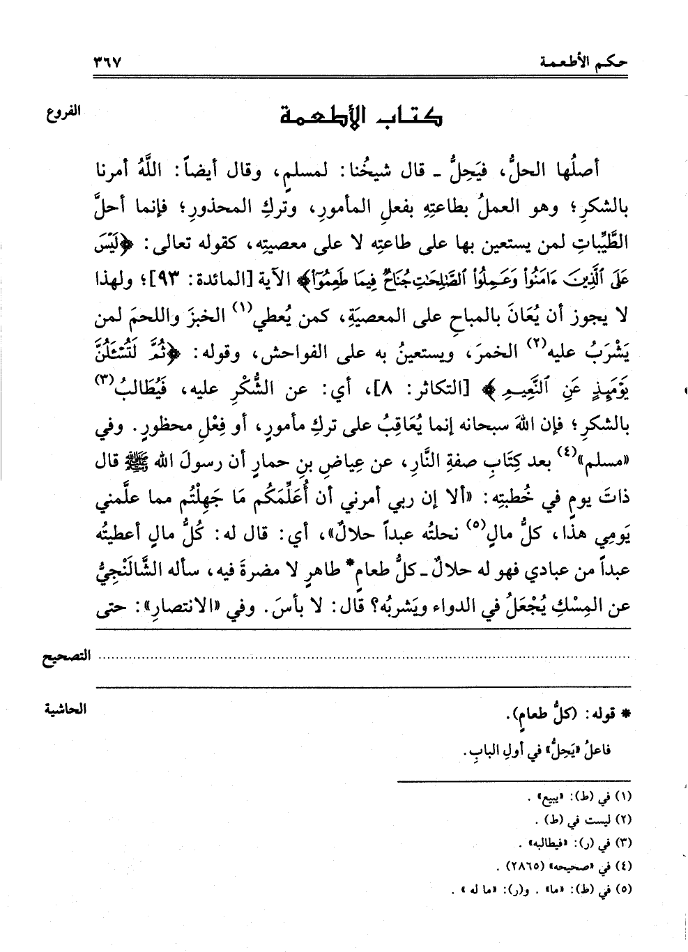 أَصْلُهَا الْحِلُّ فَيَحِلُّ قَالَ شَيْخُنَا: لِمُسْلِمٍ. وَقَالَ أَيْضًا: اللَّهُ أَمَرَنَا بِالشُّكْرِ, وَهُوَ الْعَمَلُ بِطَاعَتِهِ بِفِعْلِ الْمَأْمُورِ, وَتَرْكِ الْمَحْذُورِ, فَإِنَّمَا أَحَلَّ الطَّيِّبَاتِ لِمَنْ يَسْتَعِينُ بِهَا عَلَى طَاعَتِهِ لَا عَلَى مَعْصِيَتِهِ كَقَوْلِهِ تَعَالَى: {لَيْسَ عَلَى الَّذِينَ آمَنُوا وَعَمِلُوا الصَّالِحَاتِ جُنَاحٌ فِيمَا طَعِمُوا} [المائدة: 93] الْآيَةُ, وَلِهَذَا لَا يَجُوزُ أَنْ يُعَانَ بِالْمُبَاحِ عَلَى المعصية, كمن يعطي1 الخبز واللحم لمن يشرب عليه2 الْخَمْرَ وَيَسْتَعِينُ بِهِ عَلَى الْفَوَاحِشِ. وَقَوْلُهُ: {ثُمَّ لَتُسْأَلُنَّ يَوْمَئِذٍ عَنِ النَّعِيمِ} [التكاثر:8] أَيْ عَنْ الشُّكْرِ عَلَيْهِ فَيُطَالَبُ3 بِالشُّكْرِ فَإِنَّ اللَّهَ سُبْحَانَهُ إنَّمَا يُعَاقِبُ عَلَى تَرْكِ مَأْمُورٍ, أَوْ فِعْلِ مَحْظُورٍ. وَفِي مُسْلِمٍ4 بَعْدَ كِتَابِ صِفَةِ النَّارِ, عَنْ عِيَاضِ بْنِ حِمَارٍ أَنَّ رَسُولَ اللَّهِ صَلَّى اللَّهُ عَلَيْهِ وَسَلَّمَ قَالَ ذَاتَ يَوْمٍ فِي خُطْبَتِهِ "أَلَا إنَّ رَبِّي أَمَرَنِي أَنْ أُعَلِّمَكُمْ مَا جَهِلْتُمْ مِمَّا عَلَّمَنِي يَوْمِي هَذَا, كل مال5 نَحَلْته عَبْدًا حَلَالٌ" أَيْ قَالَ اللَّهُ كُلُّ مَالٍ أَعْطَيْته عَبْدًا مِنْ عِبَادِي فَهُوَ لَهُ حَلَالٌ كُلُّ طَعَامٍ طَاهِرٍ لَا مَضَرَّةَ فِيهِ, سَأَلَهُ الشَّالَنْجِيُّ عَنْ الْمِسْكِ يُجْعَلُ فِي الدَّوَاءِ وَيُشْرِبُهُ قَالَ: لَا بَأْسَ. وَفِي الِانْتِصَارِ: حَتَّى