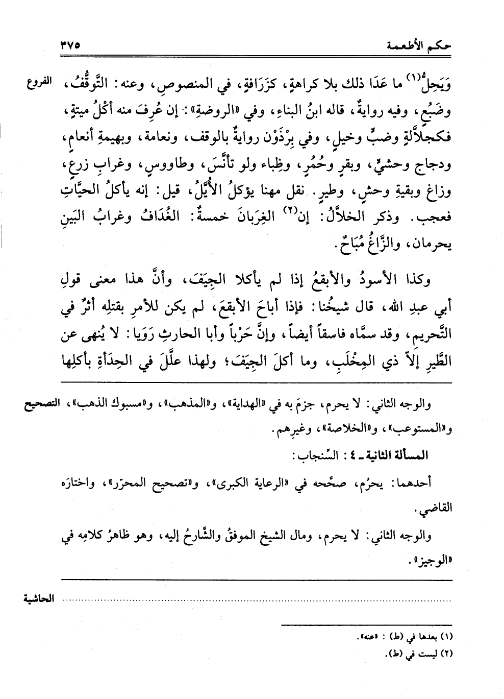 ويحل1 ما عَدَا ذَلِكَ بِلَا كَرَاهَةٍ, كَزَرَافَةٍ, فِي الْمَنْصُوصِ. وَعَنْهُ التَّوَقُّفُ, وَضَبُعٍ, وَفِيهِ رِوَايَةٌ قَالَهُ ابْنُ الْبَنَّاءِ وَفِي الرَّوْضَةِ: إنْ عُرِفَ مِنْهُ أَكَلَ مَيِّتَةً فَكَجَلَّالَةٍ. وَضَبٍّ وَخَيْلٍ, وَفِي بِرْذَوْنٍ رِوَايَةٌ بِالْوَقْفِ, وَنَعَامَةٍ وَبَهِيمَةِ أَنْعَامٍ وَدَجَاجٍ وَوَحْشِيِّ بَقَرٍ وَحُمُرٌ وَظِبَاءٍ وَلَوْ تَأَنَّسَ, وَطَاوُوسٍ وَغُرَابِ زَرْعٍ وِزَاغٍ وَبَقِيَّةِ وَحْشٍ وَطَيْرٍ, نَقَلَ مُهَنَّا: يُؤْكَلُ الْأُيَّلُ: قِيلَ: إنَّهُ يَأْكُلُ الْحَيَّاتِ, فَعَجِبَ وَذَكَرَ الخلال إن2 الْغِرْبَانَ خَمْسَةً: الْغُدَافُ وَغُرَابُ الْبَيْنِ يَحْرُمَانِ, وَالزَّاغُ مُبَاحٌ.
