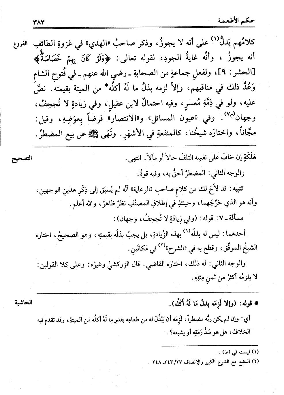 كلامهم يدل1 عَلَى أَنَّهُ لَا يَجُوزُ, وَذَكَرَ صَاحِبُ الْهَدْيِ فِي غَزْوَةِ الطَّائِفِ أَنَّهُ يَجُوزُ, وَأَنَّهُ غَايَةُ الْجُودِ لِقَوْلِهِ تَعَالَى {وَلَوْ كَانَ بِهِمْ خَصَاصَةٌ} [الحشر: 9] وَلِفِعْلِ جَمَاعَةٍ مِنْ الصَّحَابَةِ رَضِيَ اللَّهُ عَنْهُمْ فِي فُتُوحِ الشَّامِ, وَعَدَ ذَلِكَ فِي مَنَاقِبِهِمْ, وَإِلَّا لَزِمَهُ بَذْلُ مَا لَهُ أَكْلُهُ مِنْ الْمَيْتَةِ بِقِيمَتِهِ, نَصَّ عَلَيْهِ, وَلَوْ فِي ذِمَّةِ مُعْسِرٍ, وَفِيهِ احْتِمَالٌ لِابْنِ عَقِيلٍ, وَفِي زيادة لا تجحف وجهان "م 7" وفي عُيُونِ الْمَسَائِلِ وَالِانْتِصَارِ قَرْضًا بِعِوَضِهِ, وَقِيلَ: مَجَّانًا وَاخْتَارَهُ شَيْخُنَا, كَالْمَنْفَعَةِ فِي الْأَشْهَرِ. وَنَهَى صَلَّى اللَّهُ عَلَيْهِ وَسَلَّمَ عَنْ بَيْعِ الْمُضْطَرِّ,