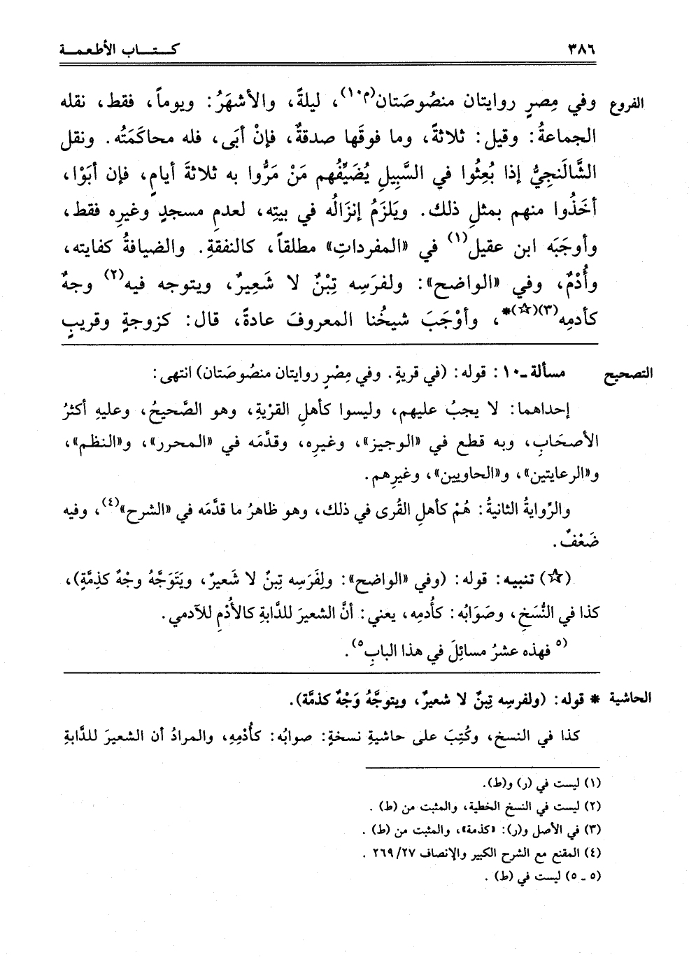 وَفِي مِصْرَ رِوَايَتَانِ, مَنْصُوصَتَانِ "م 10" لَيْلَةً, وَالْأَشْهَرُ ويوما, فقط, نقله الْجَمَاعَةُ, وَقِيلَ: ثَلَاثَةً وَمَا فَوْقَهَا صَدَقَةٌ, فَإِنْ أَبَى فَلَهُ مُحَاكَمَتُهُ. وَنَقَلَ الشَّالَنْجِيُّ إذَا بَعَثُوا فِي السَّبِيلِ يُضَيِّفُهُمْ مَنْ مَرُّوا بِهِ ثَلَاثَةَ أَيَّامٍ, فَإِنْ أَبَوْا أَخَذُوا مِنْهُمْ بِمِثْلِ ذَلِكَ. وَيَلْزَمُ إنْزَالُهُ فِي بَيْتِهِ لِعَدَمِ مَسْجِدٍ وَغَيْرِهِ فقط, وأوجبه ابن عقيل1 فِي الْمُفْرَدَاتِ مُطْلَقًا, كَالنَّفَقَةِ. وَالضِّيَافَةُ كِفَايَتُهُ وَأَدَمٌ, وَفِي الْوَاضِحِ وَلِفَرَسِهِ تِبْنٌ لَا شَعِيرٌ, وَيَتَوَجَّهُ فِيهِ2 وَجْهٌ كَأَدَمِهِ3, وَأَوْجَبَ شَيْخُنَا الْمَعْرُوفَ عَادَةً قال: كزوجة وقريب