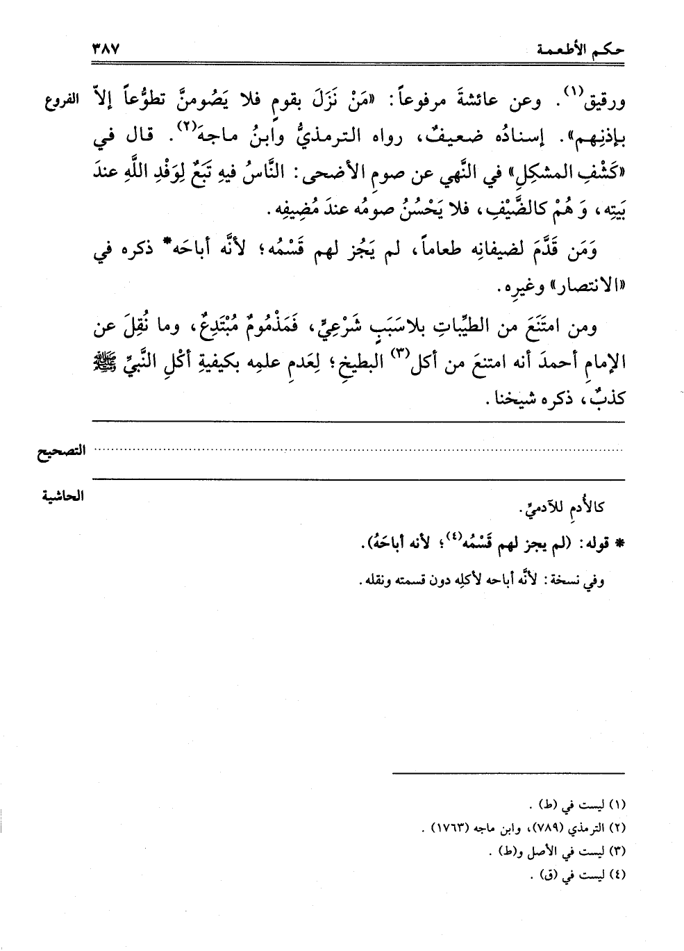 وَرَفِيقٍ1. وَعَنْ عَائِشَةَ مَرْفُوعًا "مَنْ نَزَلَ بِقَوْمٍ فَلَا يَصُومَنَّ تَطَوُّعًا إلَّا بِإِذْنِهِمْ" إسْنَادُهُ ضَعِيفٌ, رَوَاهُ التِّرْمِذِيُّ وَابْنُ مَاجَهْ2, قَالَ فِي كَشْفِ الْمُشْكَلِ فِي النَّهْيِ عَنْ صَوْمِ الْأَضْحَى: النَّاسُ فِيهِ تَبَعٌ لِوَفْدِ اللَّهِ عِنْدَ بَيْتِهِ, وَهُمْ كَالضَّيْفِ, فَلَا يَحْسُنُ صَوْمُهُ عِنْدَ مُضِيفِهِ.