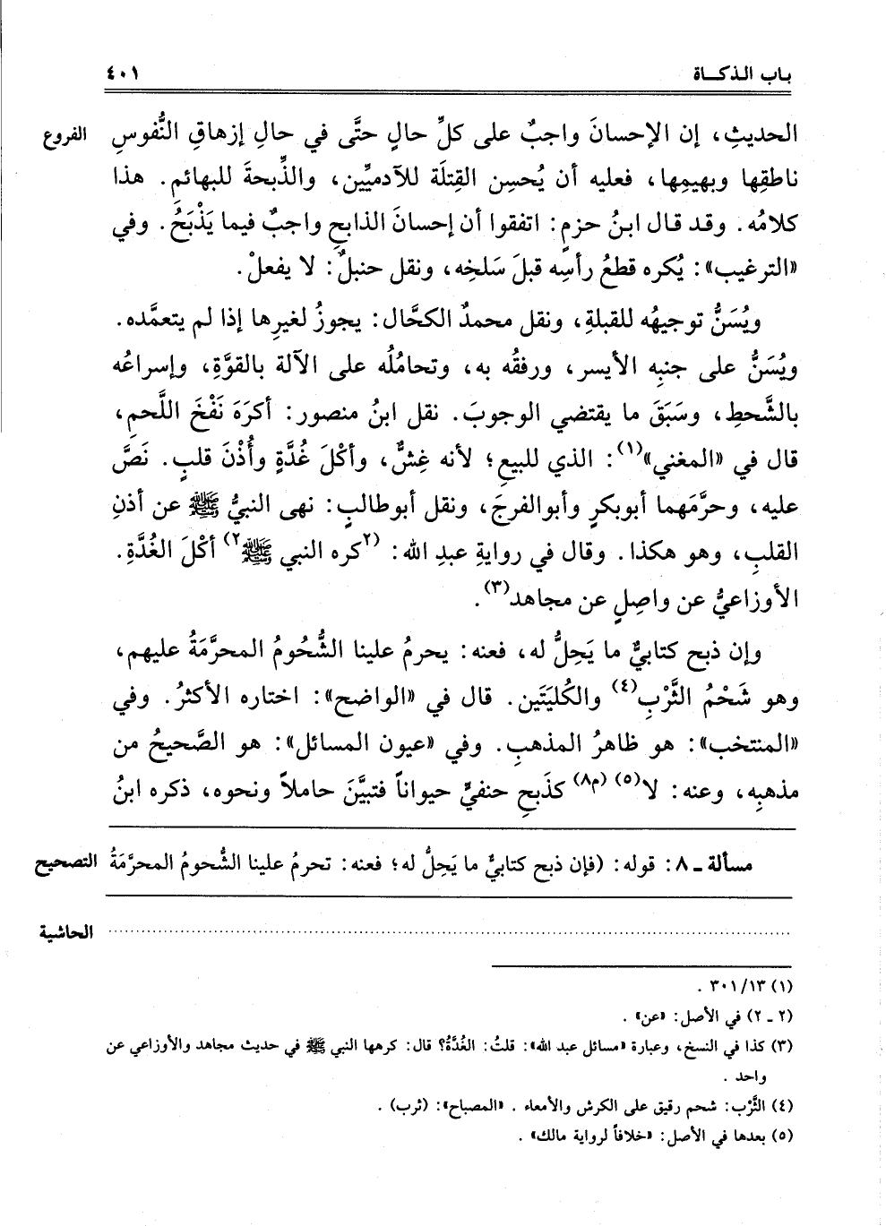 الْحَدِيثِ, إنَّ الْإِحْسَانَ وَاجِبٌ عَلَى كُلِّ حَالٍّ حَتَّى فِي حَالِّ إزْهَاقِ النُّفُوسِ نَاطِقُهَا وَبَهِيمُهَا, فَعَلَيْهِ أَنْ يُحْسِنَ الْقِتْلَةَ لِلْآدَمِيِّينَ, وَالذِّبْحَةَ لِلْبَهَائِمِ, هَذَا كَلَامُهُ, وَقَدْ قَالَ ابْنُ حَزْمٍ: اتَّفَقُوا أَنَّ إحْسَانَ الذَّابِحِ وَاجِبٌ فِيمَا يَذْبَحُ. وَفِي التَّرْغِيبِ: يُكْرَهُ قَطْعُ رَأْسِهِ قَبْلَ سَلْخِهِ, وَنَقَلَ حَنْبَلٌ: لَا يَفْعَلُ.