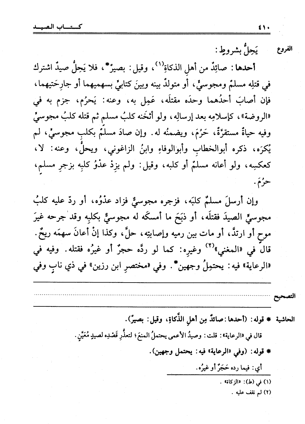 أَحَدُهَا صَائِدٌ مِنْ أَهْلِ الذَّكَاةِ1, وَقِيلَ: بَصِيرٌ, فَلَا يَحِلُّ صَيْدٌ اشْتَرَكَ فِي قَتْلِهِ مُسْلِمٌ وَمَجُوسِيٌّ, أَوْ مُتَوَلِّدٌ بَيْنَهُ وَبَيْنَ كِتَابِيٍّ بِسَهْمَيْهِمَا أَوْ جَارِحَتَيْهِمَا, فَإِنْ أَصَابَ أَحَدُهُمَا وَحْدَهُ مَقْتَلَهُ عَمِلَ بِهِ, وَعَنْهُ: يَحْرُمُ, جَزَمَ بِهِ فِي الرَّوْضَةِ, كَإِسْلَامِهِ بَعْدَ إرْسَالِهِ, وَلَوْ أَثْخَنَهُ كَلْبُ مُسْلِمٍ ثُمَّ قَتَلَهُ كَلْبُ مَجُوسِيٍّ وَفِيهِ حَيَاةٌ مُسْتَقِرَّةٌ حَرُمَ, وَيَضْمَنُهُ لَهُ. وَإِنْ صَادَ مُسْلِمٌ بِكَلْبِ مَجُوسِيٍّ لَمْ يَكْرَهْ, ذَكَرَهُ أَبُو الْخَطَّابِ وَأَبُو الْوَفَاءِ وَابْنُ الزَّاغُونِيِّ, وَيَحِلُّ, وَعَنْهُ: لَا, كَعَكْسِهِ, وَلَوْ أَعَانَهُ مُسْلِمٌ أَوْ كَلْبُهُ, وَقِيلَ: وَلَمْ يَزِدْ عَدْوُ كَلْبِهِ بِزَجْرِ مُسْلِمٍ حَرُمَ.