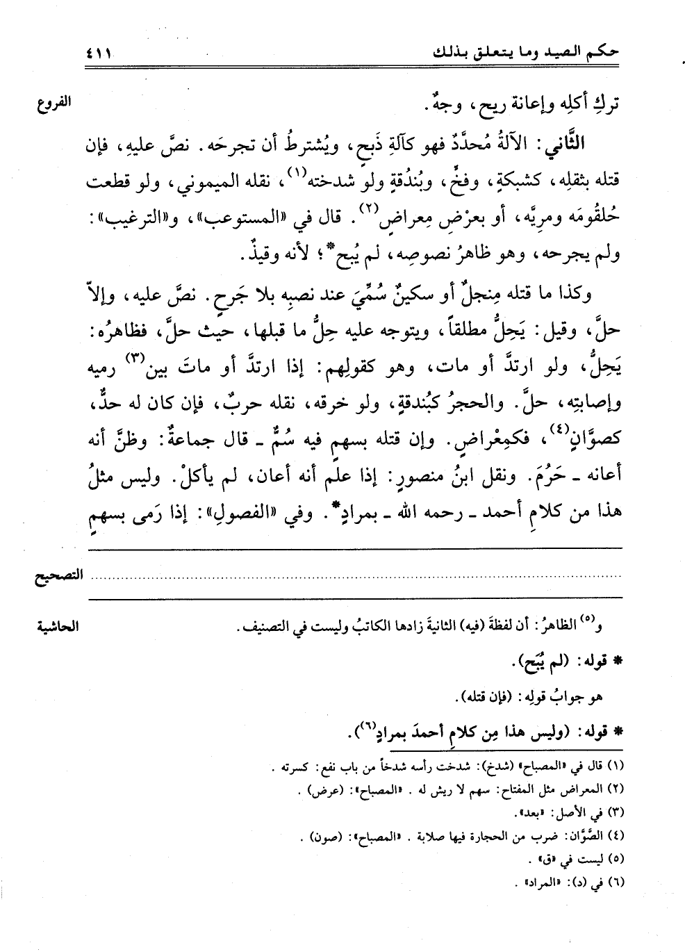 وَكَذَا مَا قَتَلَهُ مِنْجَلٌ أَوْ سِكِّينٌ سُمِّيَ عِنْدَ نَصْبِهِ بِلَا جُرْحٍ, نَصَّ عَلَيْهِ, وَإِلَّا حَلَّ, وَقِيلَ: يَحِلُّ مُطْلَقًا, وَيَتَوَجَّهُ عَلَيْهِ حِلُّ مَا قَبْلَهَا, وَحَيْثُ حَلَّ فَظَاهِرُهُ يَحِلُّ, وَلَوْ ارْتَدَّ أَوْ مَاتَ وَهُوَ كَقَوْلِهِمْ إذَا ارْتَدَّ أَوْ مَاتَ بَيْنَ3 رَمْيِهِ وَإِصَابَتِهِ حَلَّ, وَالْحَجَرُ كَبُنْدُقَةٍ وَلَوْ خَرَقَهُ, نَقَلَهُ حَرْبٌ, فَإِنْ كَانَ لَهُ حَدٌّ كَصَوَّانٍ4 فَكَمِعْرَاضٍ. وَإِنْ قَتَلَهُ بِسَهْمٍ فِيهِ سُمٌّ, قَالَ جَمَاعَةٌ: وَظَنَّ أَنَّهُ أَعَانَهُ حَرُمَ, وَنَقَلَ ابْنُ مَنْصُورٍ: إذَا عَلِمَ أَنَّهُ أَعَانَ لَمْ يَأْكُلْ, وَلَيْسَ مِثْلُ هَذَا مِنْ كَلَامِ أَحْمَدَ رَحِمَهُ اللَّهُ بِمُرَادٍ. وَفِي الْفُصُولِ: إذَا رَمْي بِسَهْمٍ