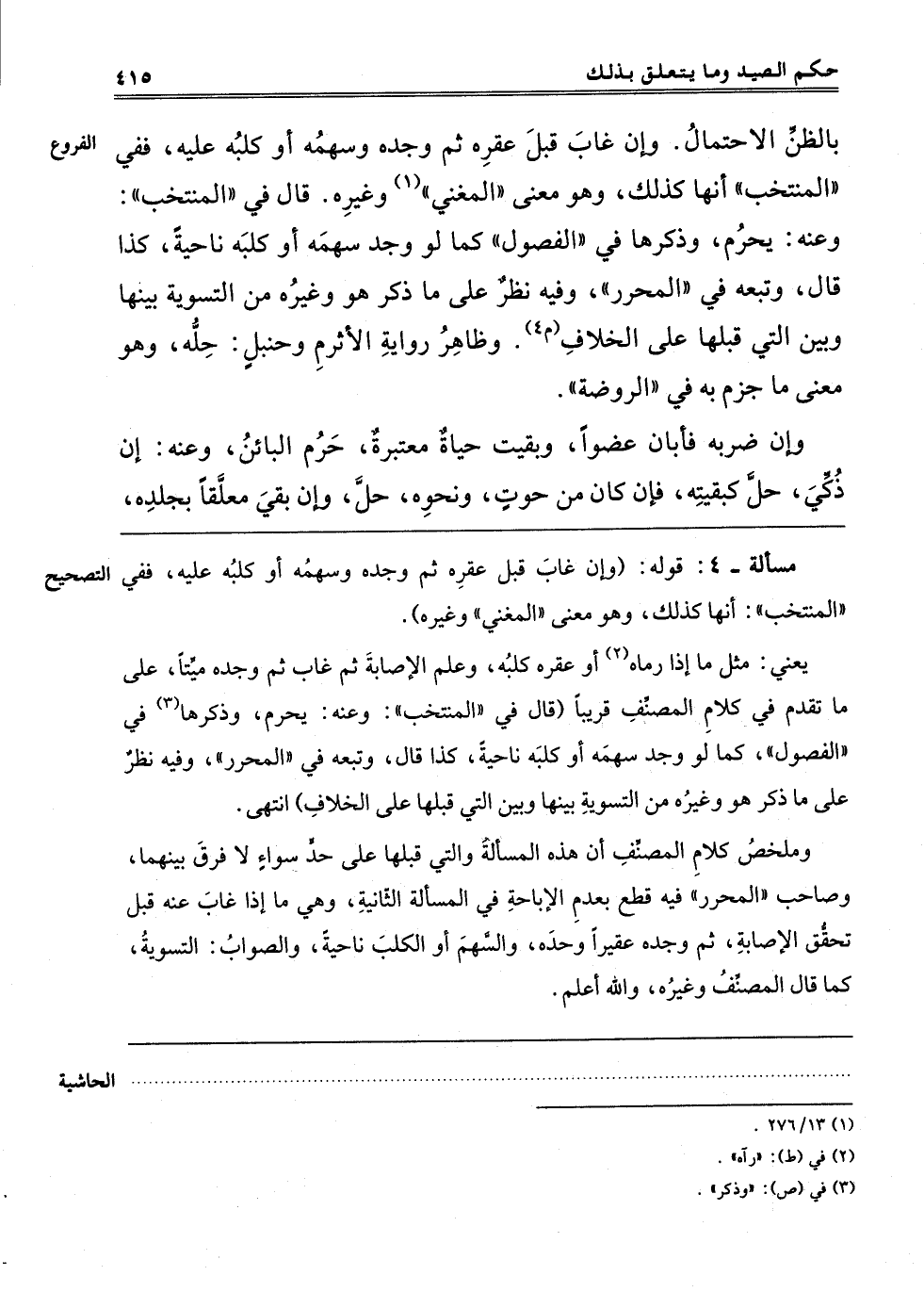 بِالظَّنِّ الِاحْتِمَالُ. وَإِنْ غَابَ قَبْلَ عَقْرِهِ ثُمَّ وَجَدَهُ وَسَهْمُهُ أَوْ كَلْبُهُ عَلَيْهِ فَفِي الْمُنْتَخَبِ أَنَّهَا كَذَلِكَ, وَهُوَ مَعْنَى الْمُغْنِي1 وَغَيْرِهِ. قَالَ فِي الْمُنْتَخَبِ: وَعَنْهُ: يَحْرُمُ, وَذَكَرَهَا فِي الْفُصُولِ, كما لو وجد سهمه أو كلبه ناحية, كذا قال, وتبعه في المحرر, وفيه نظر على ما ذكر هو وغيره من التسوية بَيْنَهَا وَبَيْنَ الَّتِي قَبْلَهَا عَلَى الْخِلَافِ "م 4" وَظَاهِرُ رِوَايَةِ الْأَثْرَمِ وَحَنْبَلٍ حِلُّهُ, وَهُوَ مَعْنَى ما جزم به في الروضة.