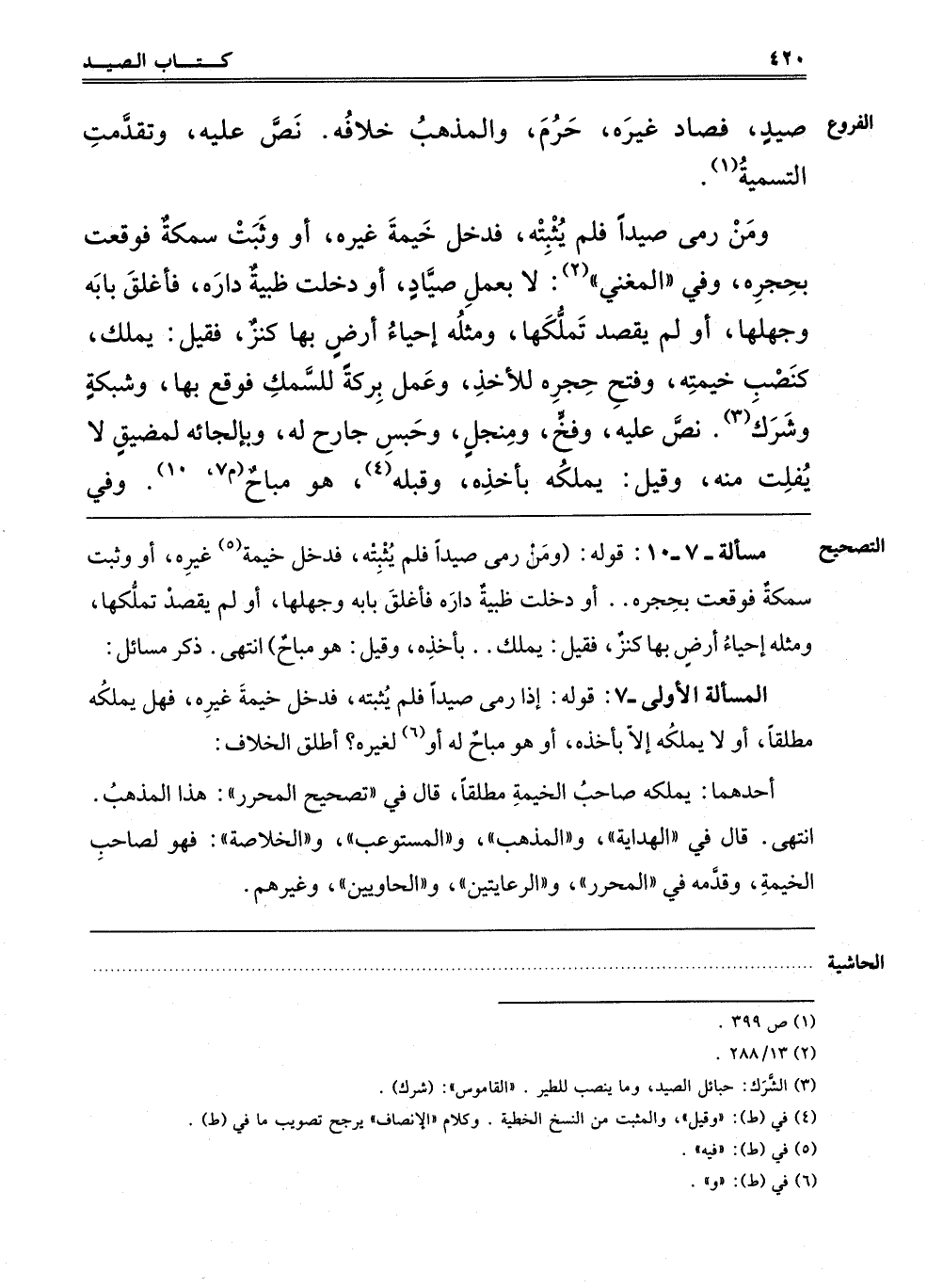 "الْمَسْأَلَةُ الْأُولَى 7" إذَا رَمَى صَيْدًا فَلَمْ يُثْبِتْهُ فَدَخَلَ خَيْمَةَ غَيْرِهِ فَهَلْ يَمْلِكُهُ مُطْلَقًا, أَوْ لَا يَمْلِكُهُ إلا بأخذه, أو هو مباح له أو6 لغيره؟ أَطْلَقَ الْخِلَافَ.