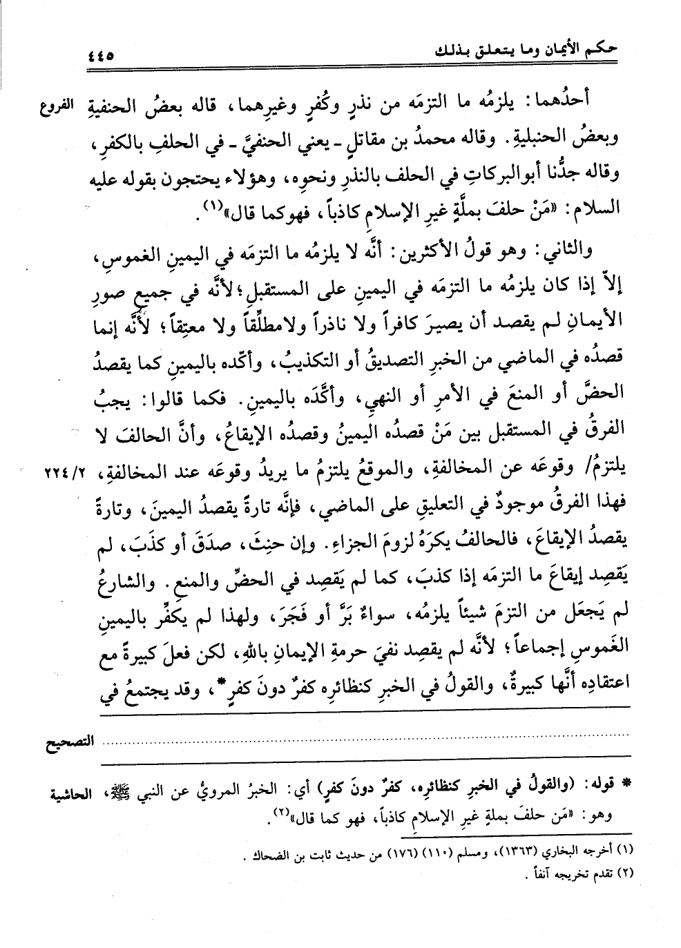 أَحَدُهُمَا يَلْزَمُهُ مَا الْتَزَمَهُ مِنْ نَذْرٍ وَكُفْرٍ, وَغَيْرُهُمَا قَالَهُ بَعْضُ الْحَنَفِيَّةِ وَبَعْضُ الْحَنْبَلِيَّةِ. وَقَالَ مُحَمَّدُ بْنُ مُقَاتِلٍ: يَعْنِي الْحَنَفِيَّ فِي الْحَلِفِ بِالْكُفْرِ, وَقَالَهُ جَدُّنَا أَبُو الْبَرَكَاتِ فِي الْحَلِفِ بِالنَّذْرِ وَنَحْوِهِ, وَهَؤُلَاءِ يَحْتَجُّونَ بِقَوْلِهِ عَلَيْهِ السَّلَامُ: "مَنْ حَلَفَ بِمِلَّةٍ غَيْرِ الْإِسْلَامِ كَاذِبًا فَهُوَ كَمَا قَالَ" 1.