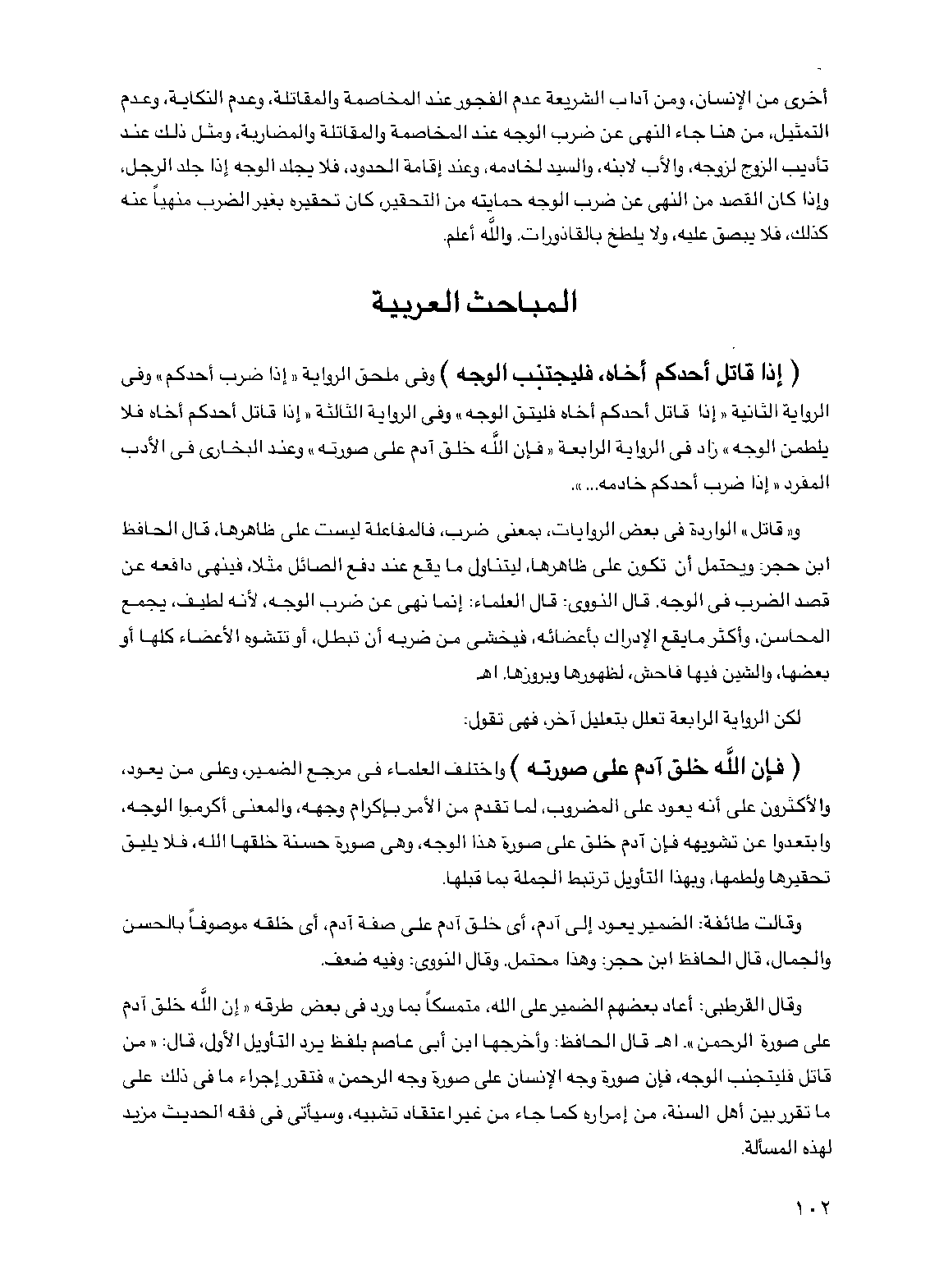(إذا قاتل أحدكم أخاه فليجتنب الوجه) وفي ملحق الرواية "إذا ضرب أحدكم" وفي الرواية الثانية "إذا قاتل أحدكم أخاه فليتق الوجه" وفي الرواية الثالثة "إذا قاتل أحدكم أخاه فلا يلطمن الوجه" زاد في الرواية الرابعة "فإن الله خلق آدم على صورته" وعند البخاري في الآدب المفرد "إذا ضرب أحدكم خادمه ... "