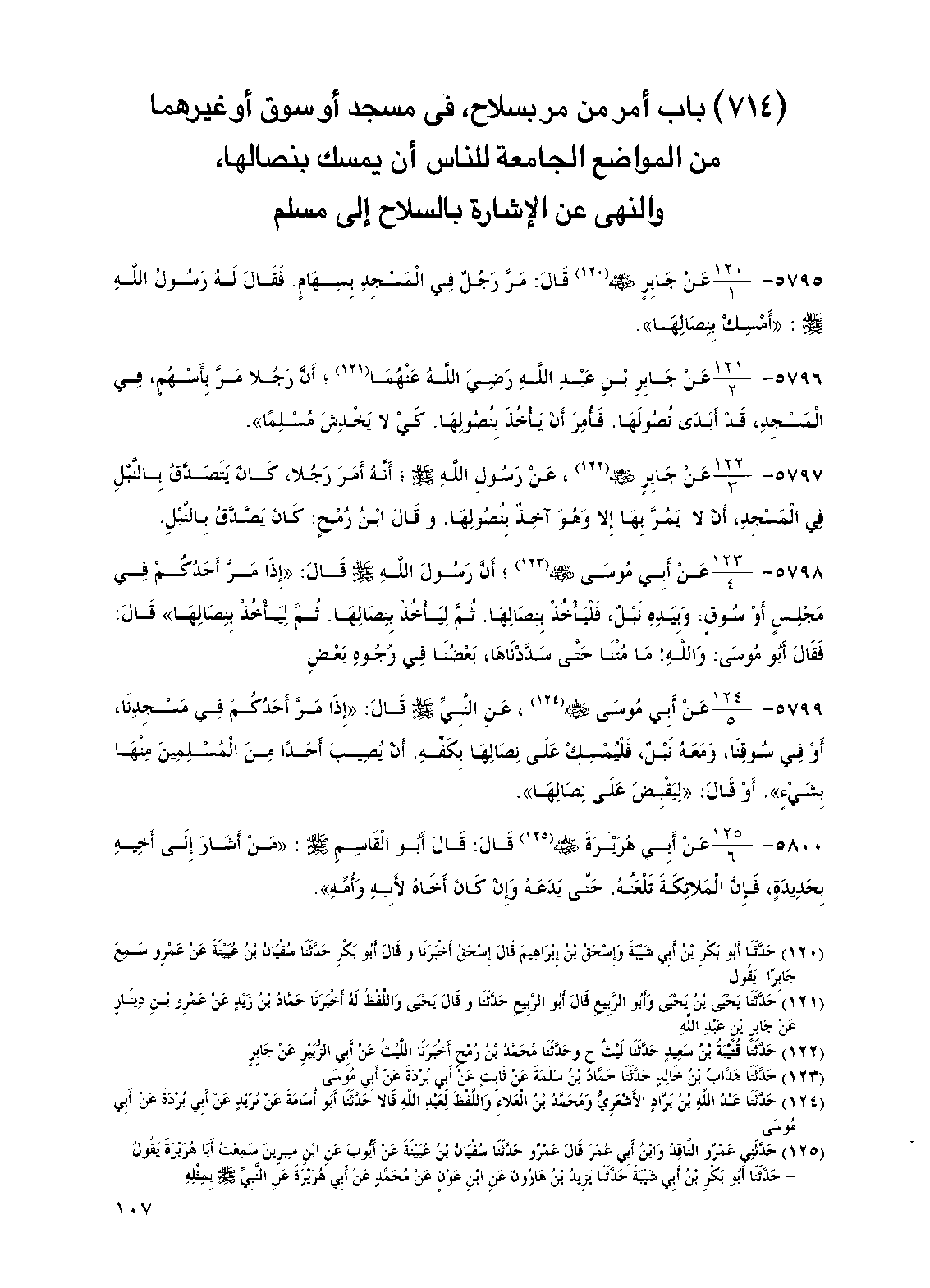 5799 - عن أبي موسى رضي الله عنه عن النبي صلى الله عليه وسلم قال "إذا مر أحدكم في مسجدنا أو في سوقنا ومعه نبل فليمسك على نصالها بكفه أن يصيب أحدا من المسلمين منها بشيء" أو قال "ليقبض على نصالها"