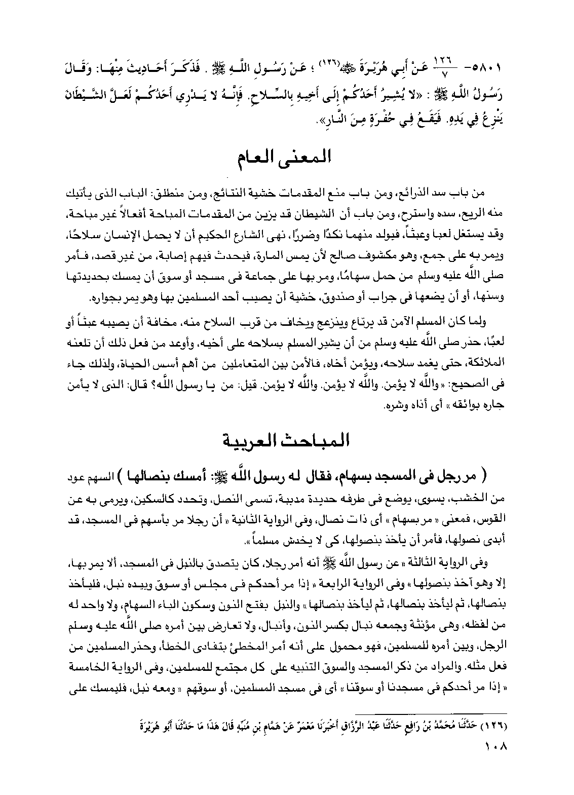 من باب سد الذرائع ومن باب منع المقدمات خشية النتائج ومن منطلق الباب الذي يأتيك منه الريح سده واسترح ومن باب أن الشيطان قد يزين من المقدمات المباحة أفعالا غير مباحة وقد يستغل لعبا وعبثا فيولد منهما نكدا وضررا نهى الشارع الحكيم أن لا يحمل الإنسان سلاحا ويمر به على جمع وهو مكشوف صالح لأن يمس المارة فيحدث فيهم إصابة من غير قصد فأمر صلى الله عليه وسلم من حمل سهاما ومر بها على جماعة في مسجد أو سوق أن يمسك بحديدتها وسنها أو أن يضعها في جراب أو صندوق خشية أن يصيب أحد المسلمين بها وهو يمر بجواره