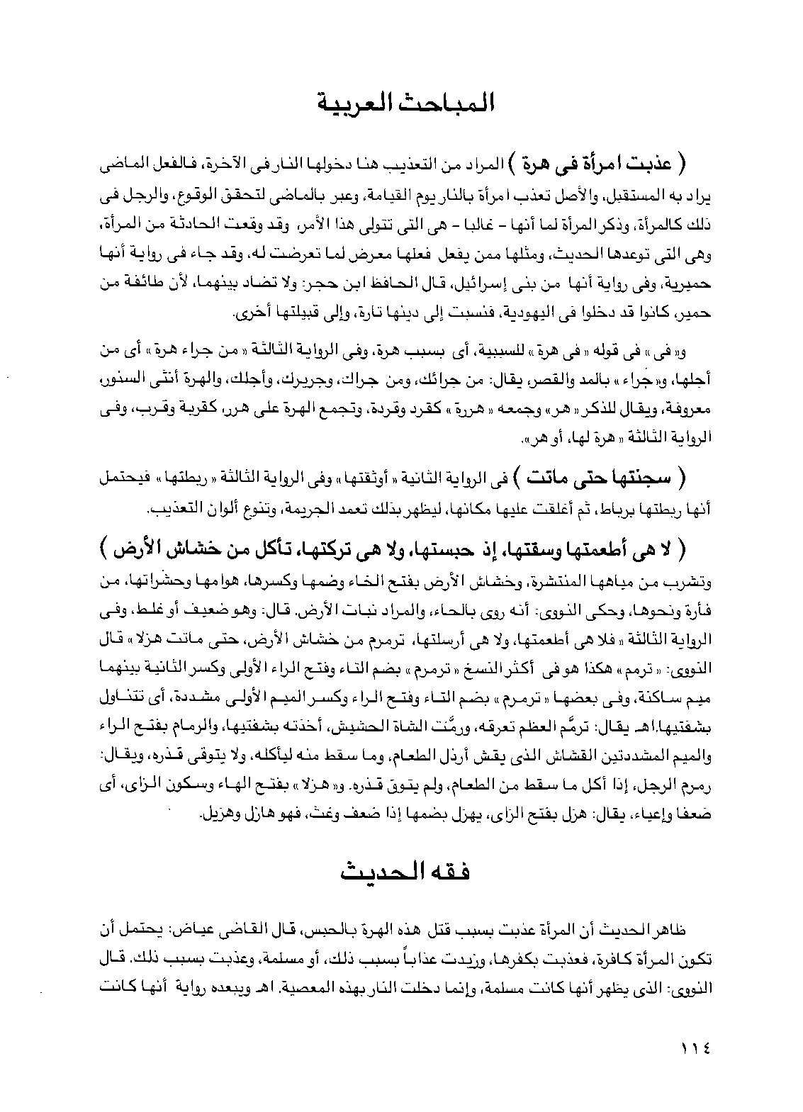 ظاهر الحديث أن المرأة عذبت بسبب قتل هذه الهرة بالحبس قال القاضي عياض يحتمل أن تكون المرأة كافرة فعذبت بكفرها وزيدت عذابا بسبب ذلك أو مسلمة وعذبت بسبب ذلك قال النووي الذي يظهر أنها كانت مسلمة وإنما دخلت النار بهذه المعصية اهـ ويبعده رواية أنها كانت